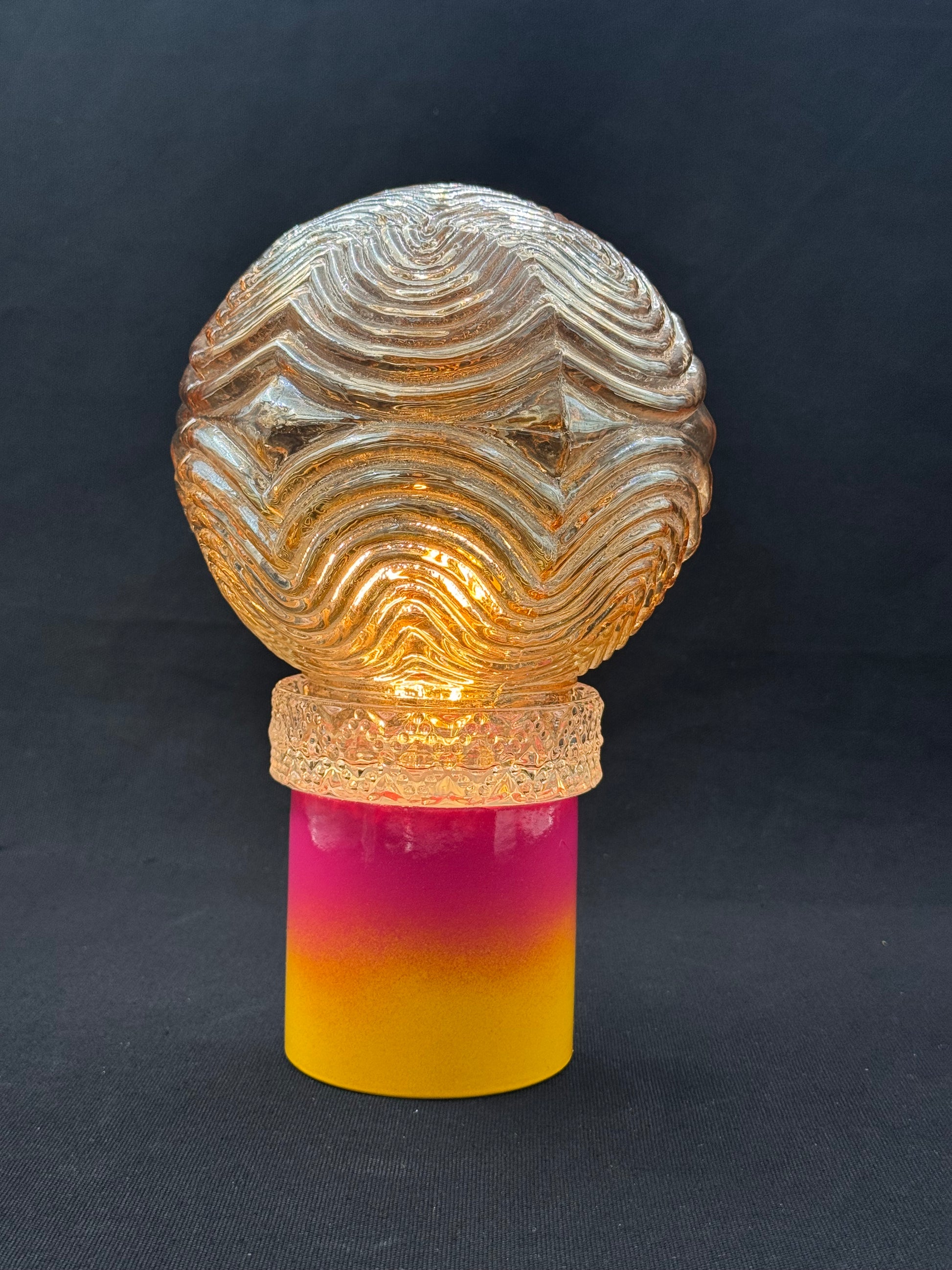 Batterilampe med knall gul og rosa med vintage champagnekuppel