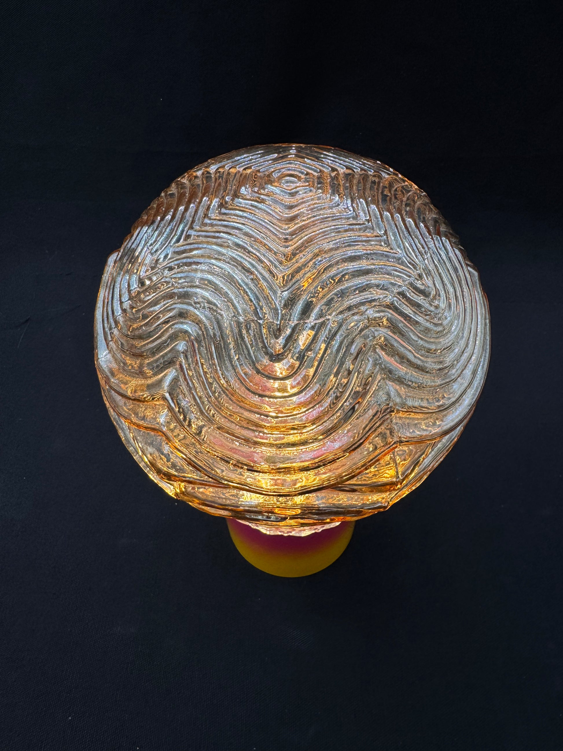 Helt unik og sjelden batterilampe. Den gamle lampekuppelen er rund, champagnefarget med fint striper mønster. Foten er malt i glade og sterke farger som gult og rosa.