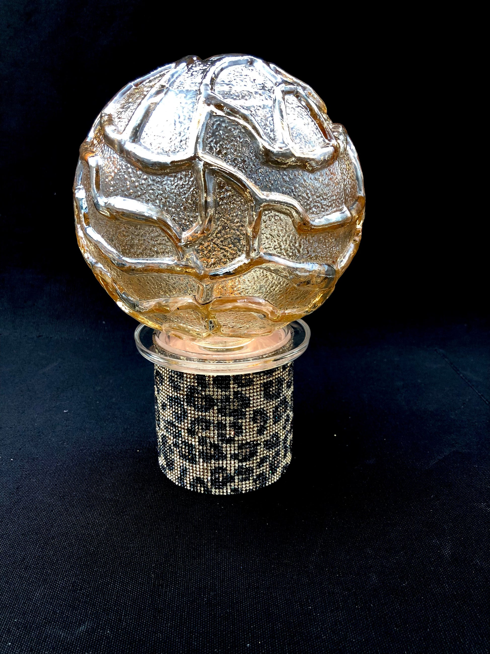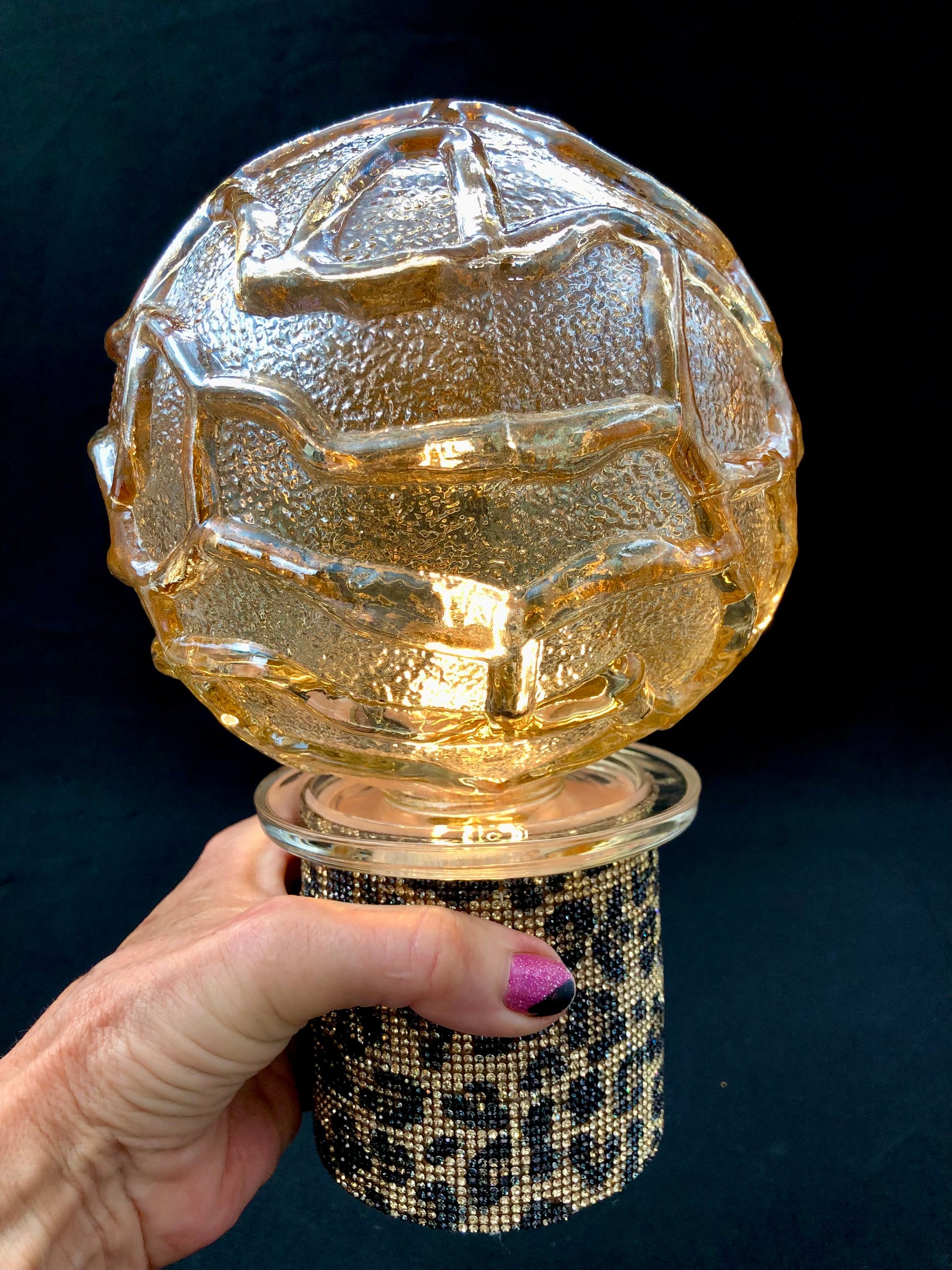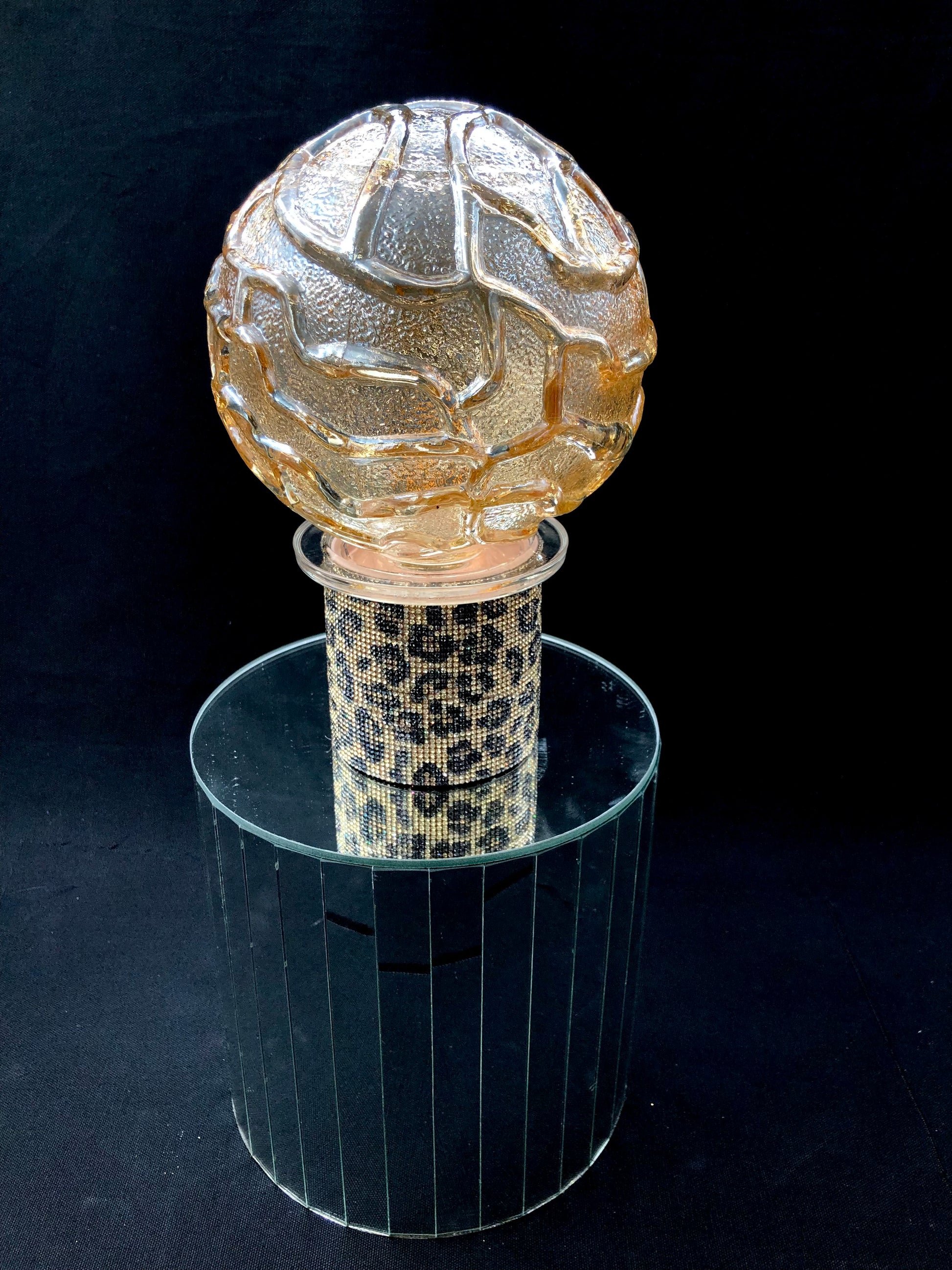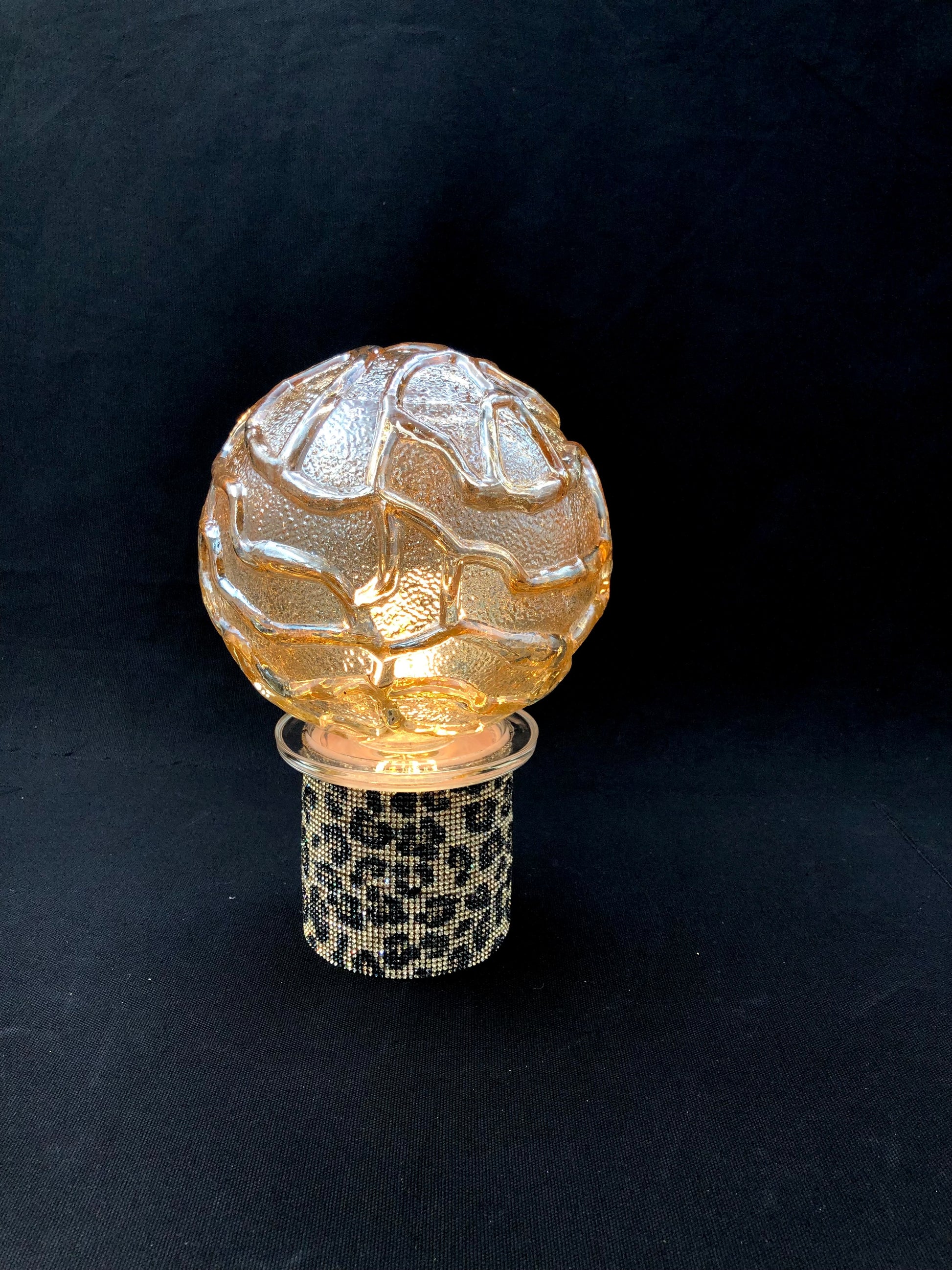 Denne batterilampen er laget med leopardmønster. Kuppelen er champagnefarget med mønster.