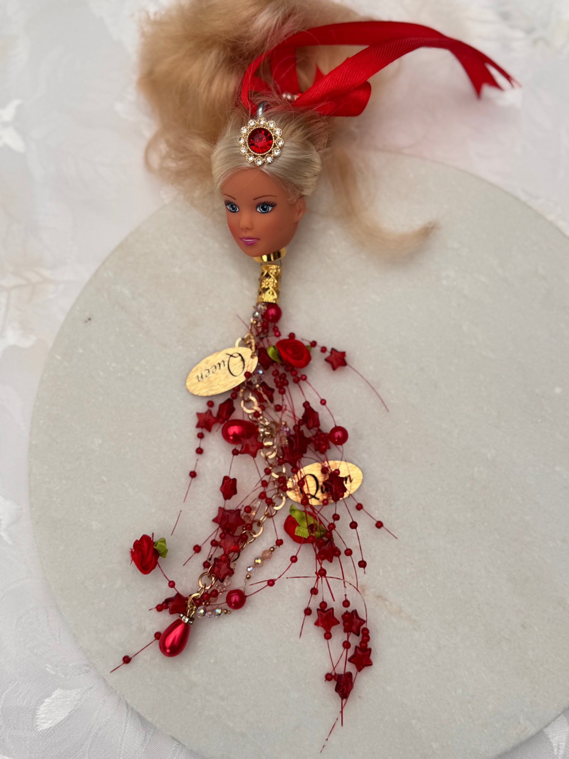 Gi juletreet ditt litt glamour og gøy med vår unike julekule laget av hodet til en vintage Barbiedukke! Hver kule er håndlaget og pyntet med luksuriøse stener, diamanter og glitrende vintage smykker – ingen er like, akkurat som julemagien selv.