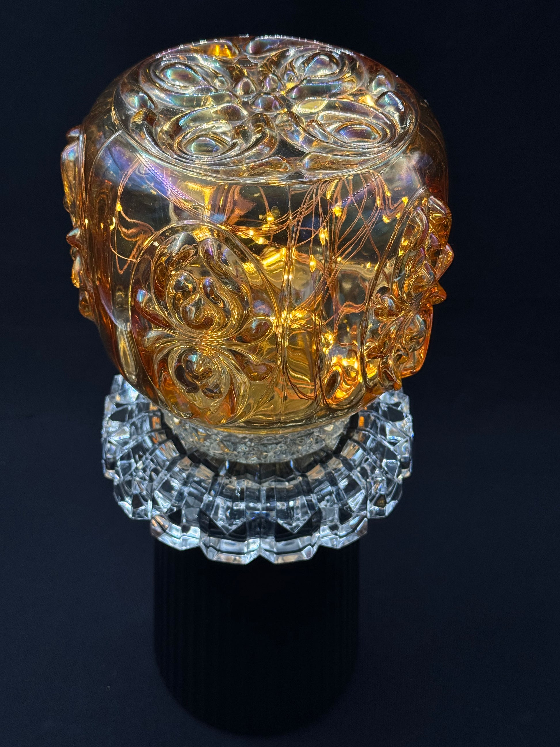 Denne fantastiske lampen er lagd av krystall og glass. Vintage kuppelen gnistrer av diamanter med gullfarget glass. Du kan velge om du vil bruke den som høy bordlampe eller lav bordlampe ved å kun sette kuppelen på bordet.