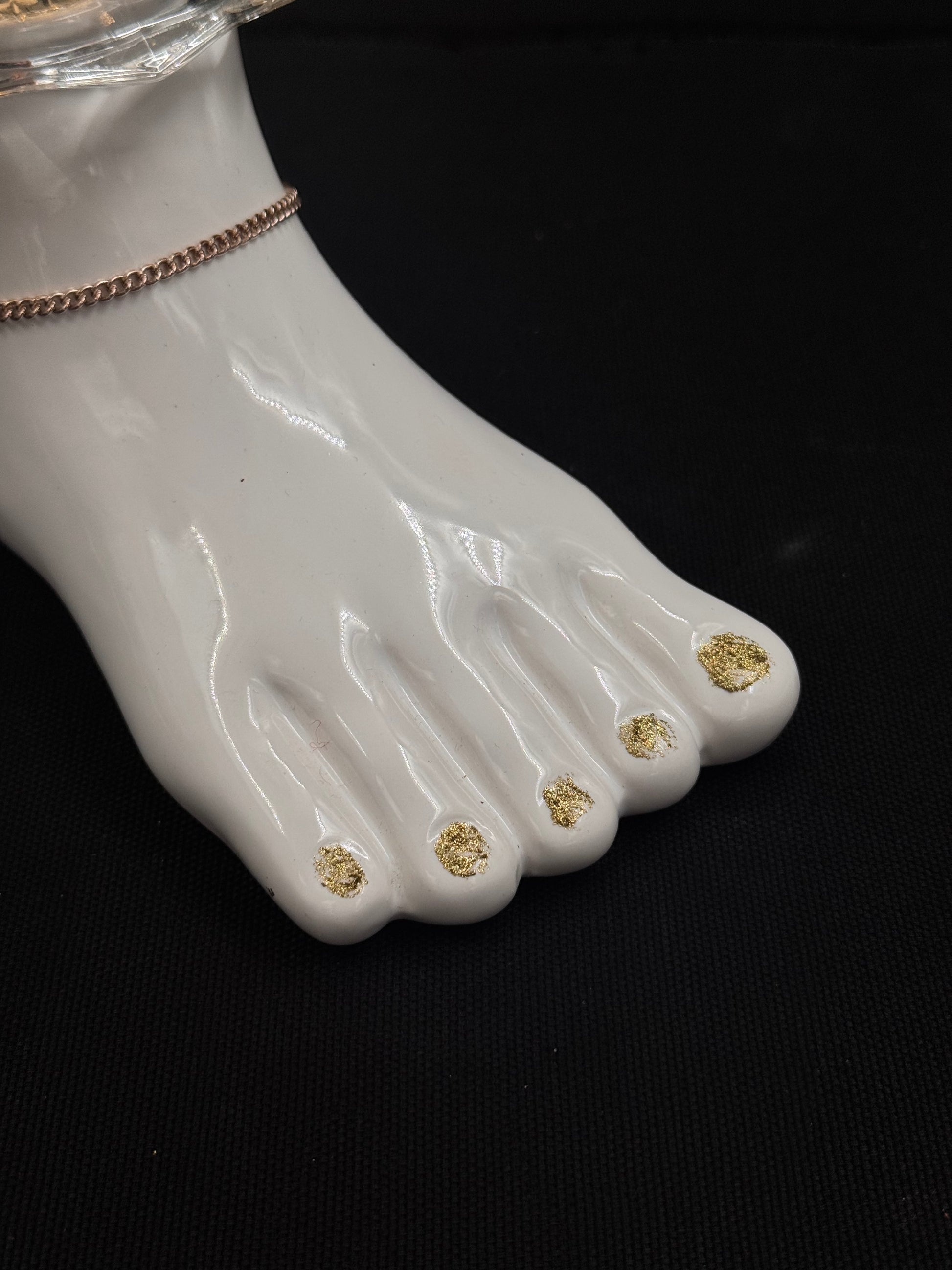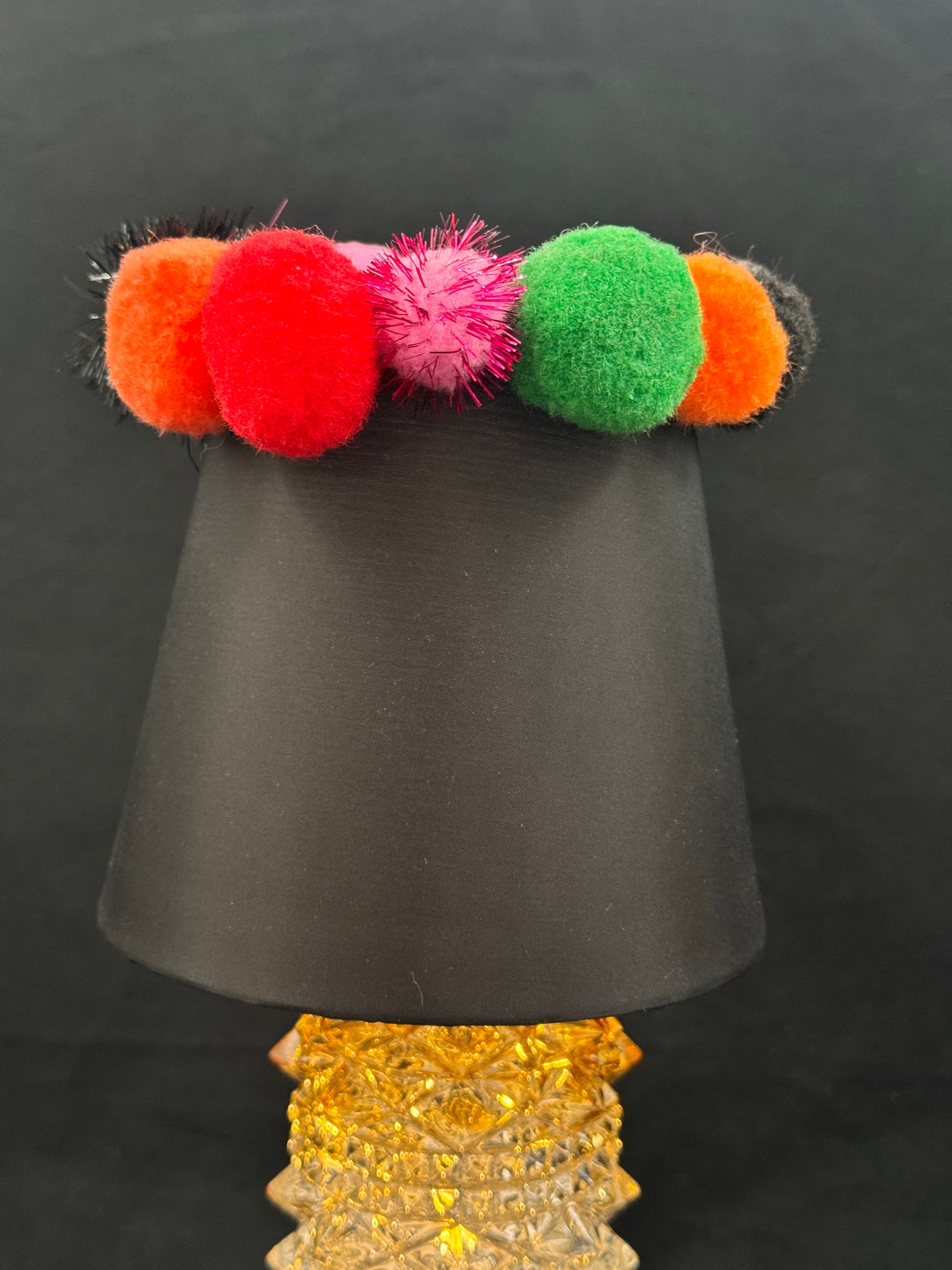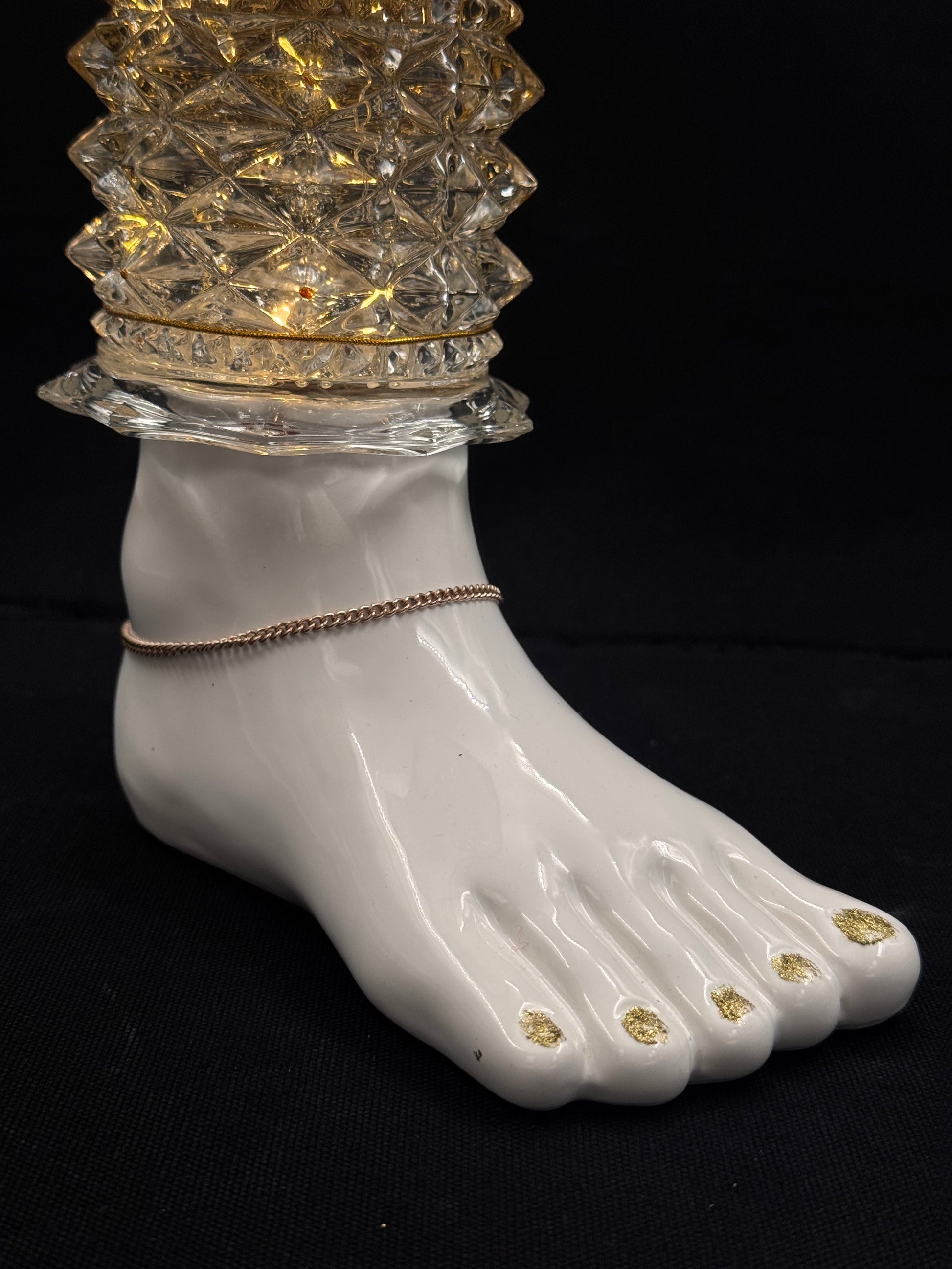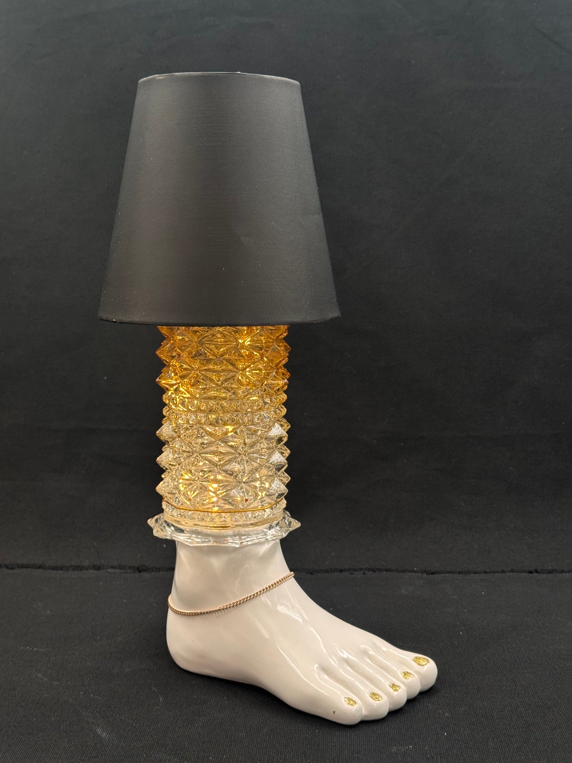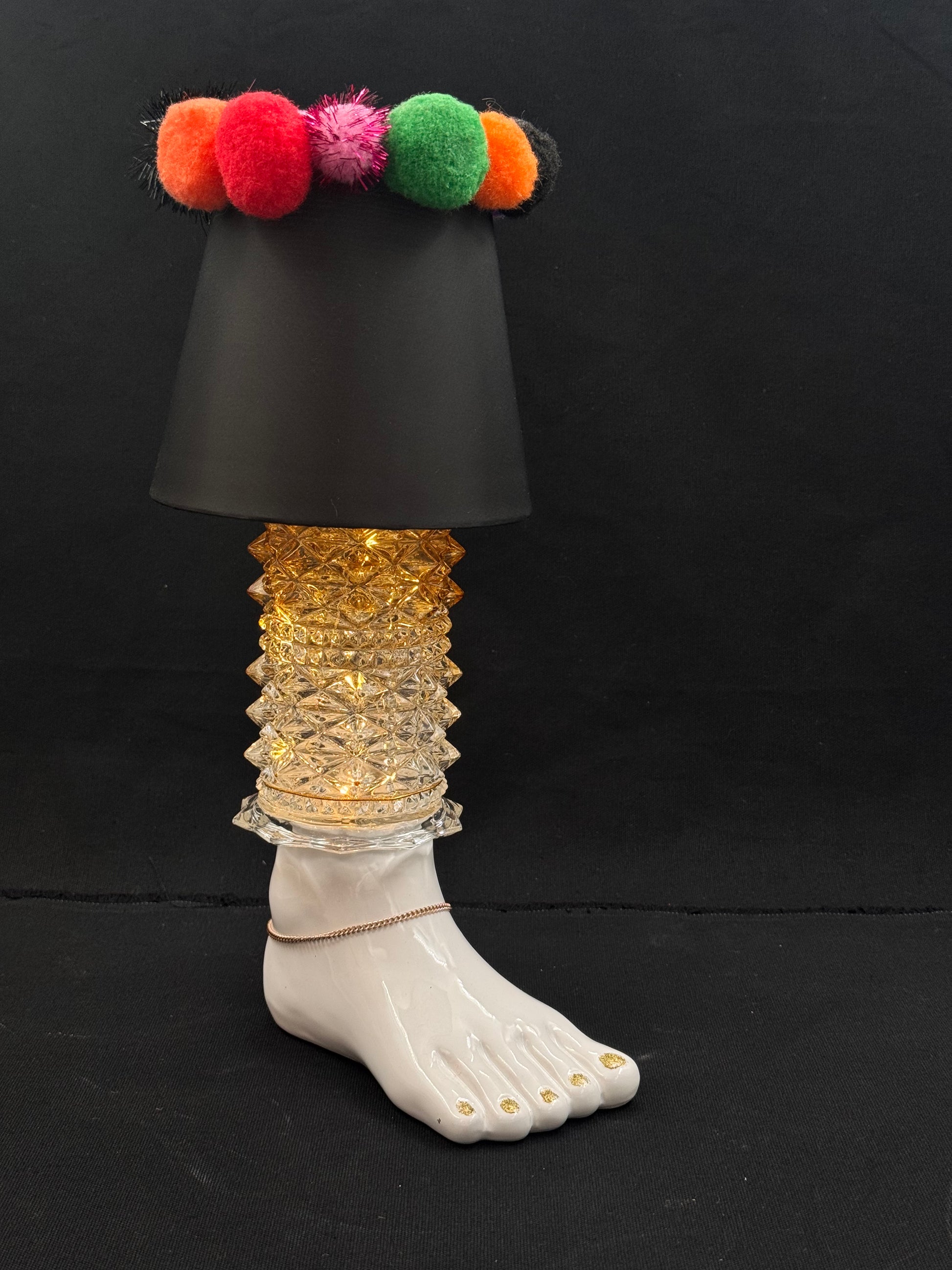Denne morsomme lampen er lagd utav en porselenfot. Vi har lakkert neglene med gullmaling og foten har fått en ankellenke. Leggen er en vintage kuppel med nydelig mønster. Lampeskjermen er svart med fargerike pompous, men du kan bytte den ut i en annen farge. Gi beskjed.