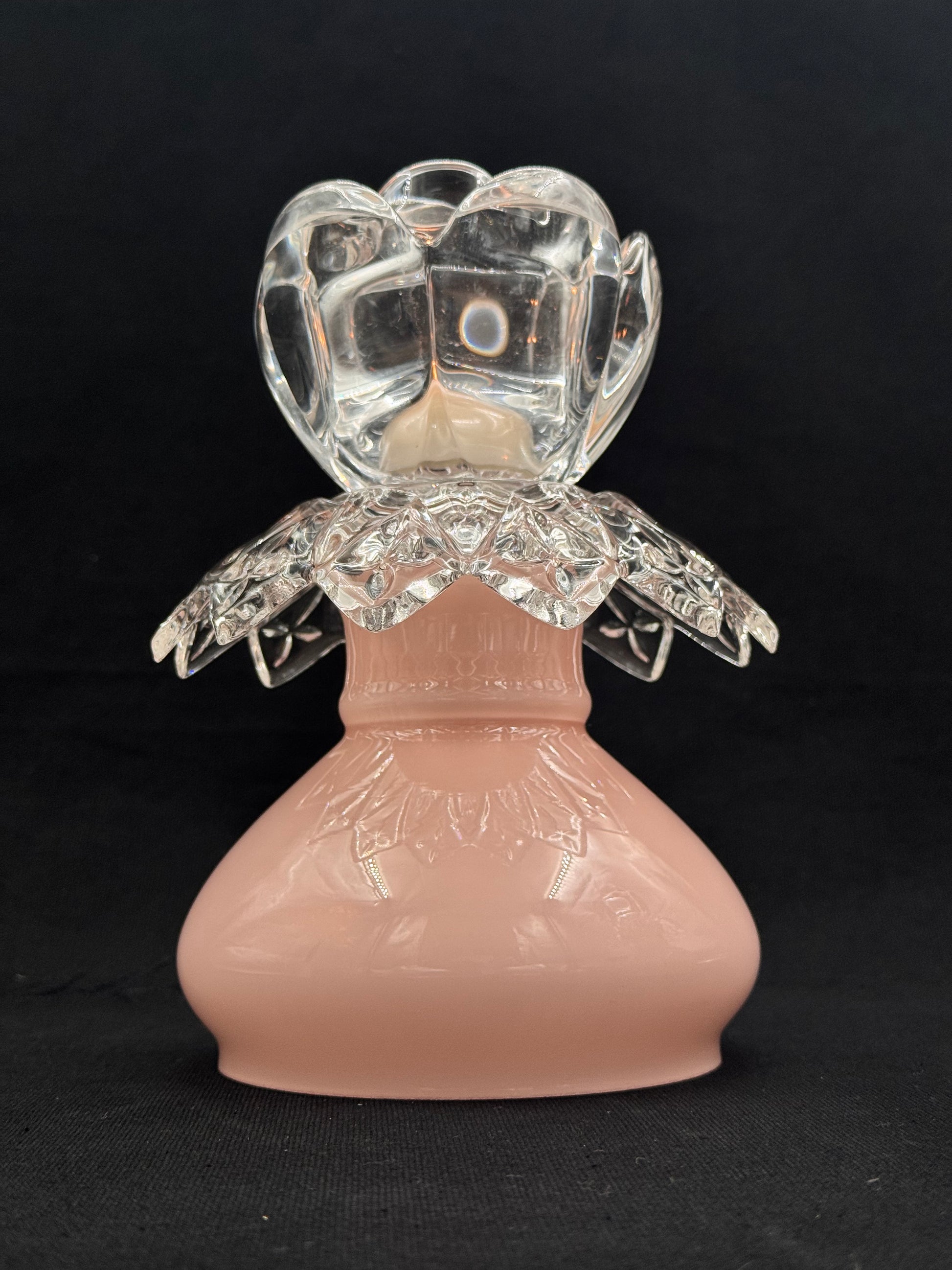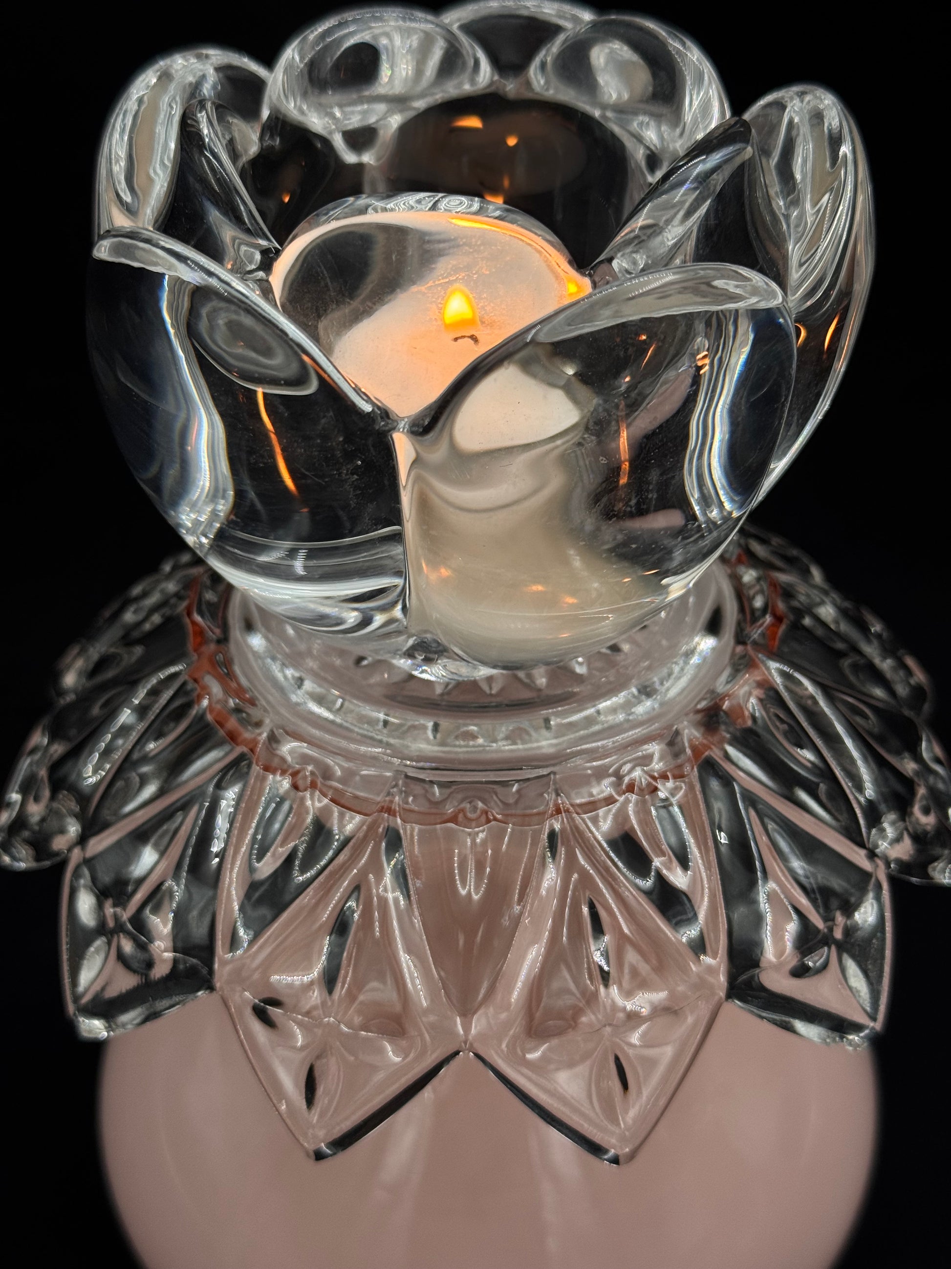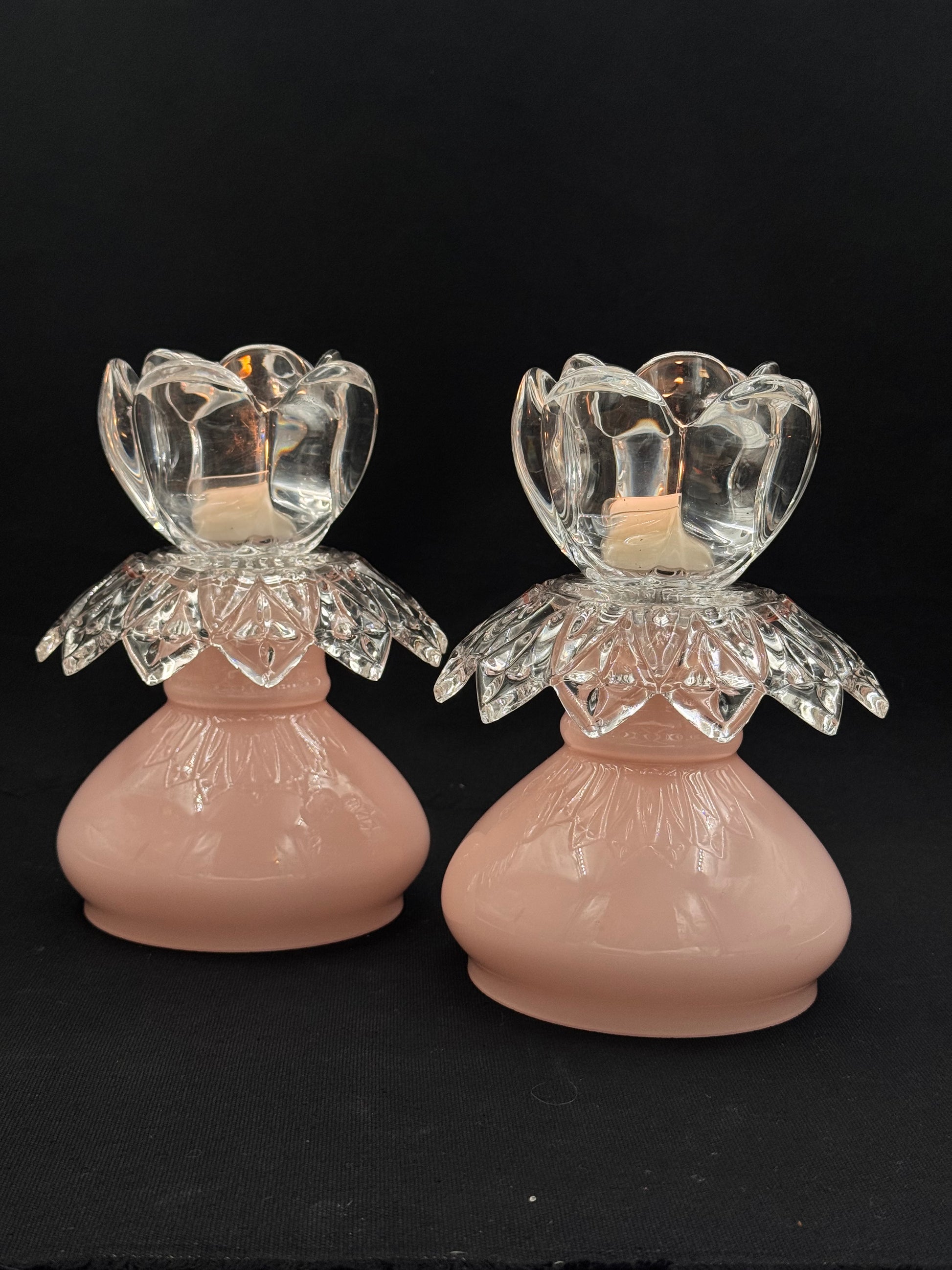 Denne lysestaken er satt sammen av orrefors krystall og lyserosa lampekuppel. Lysestaken har en dus og fin farge og vil gi en lun og varm atmosfære til interiøret. Vi har t0 stk av denne hvis du vil kjøpe deg et par. Vi har også en som er et hakk større.