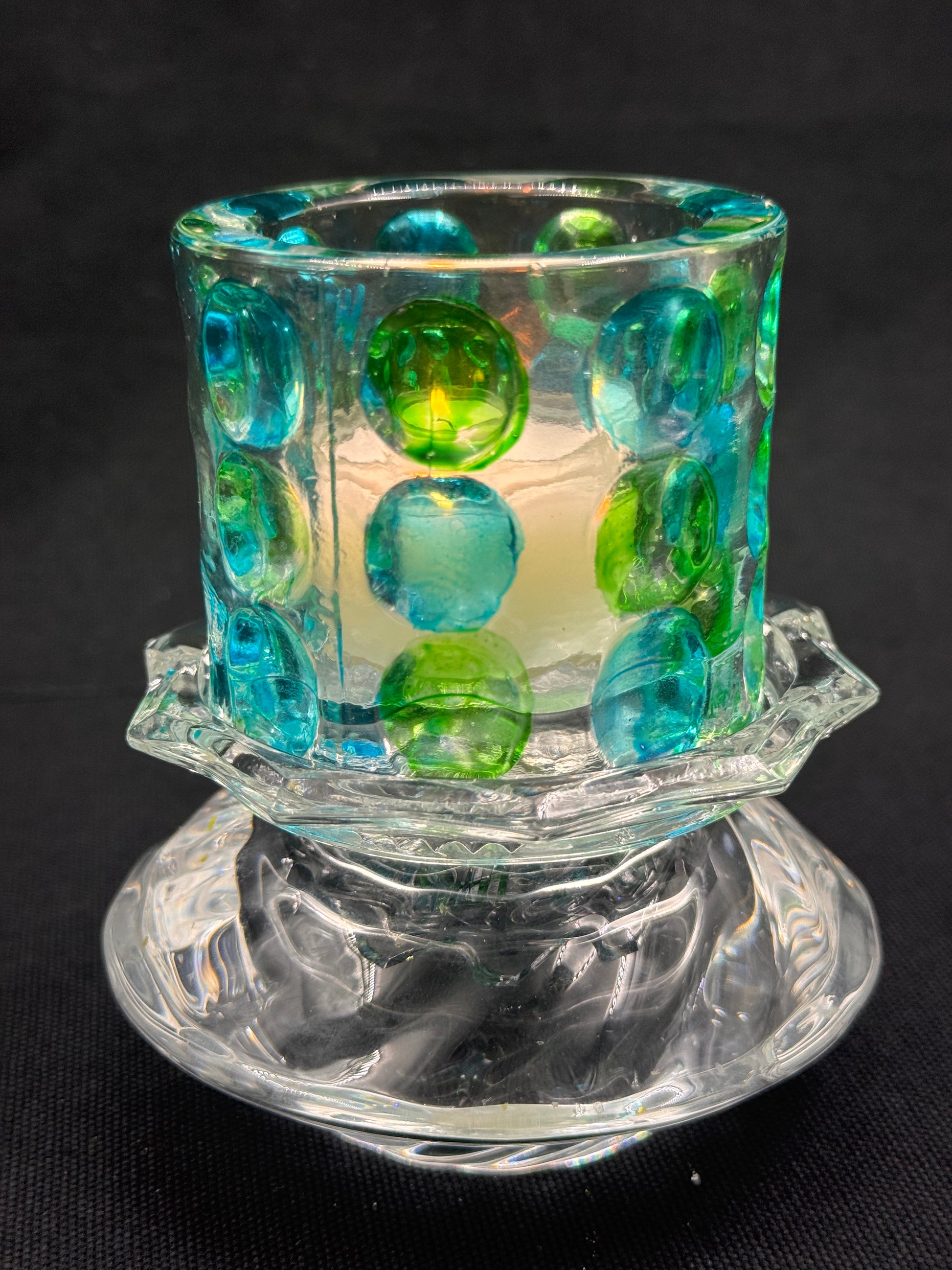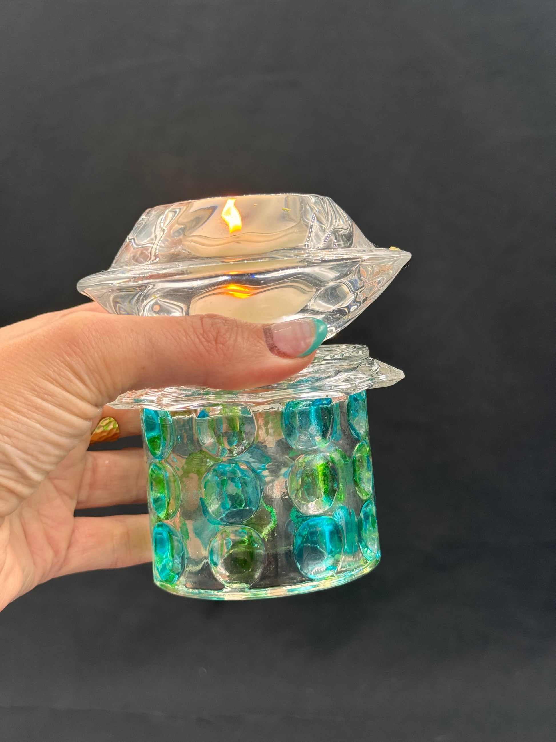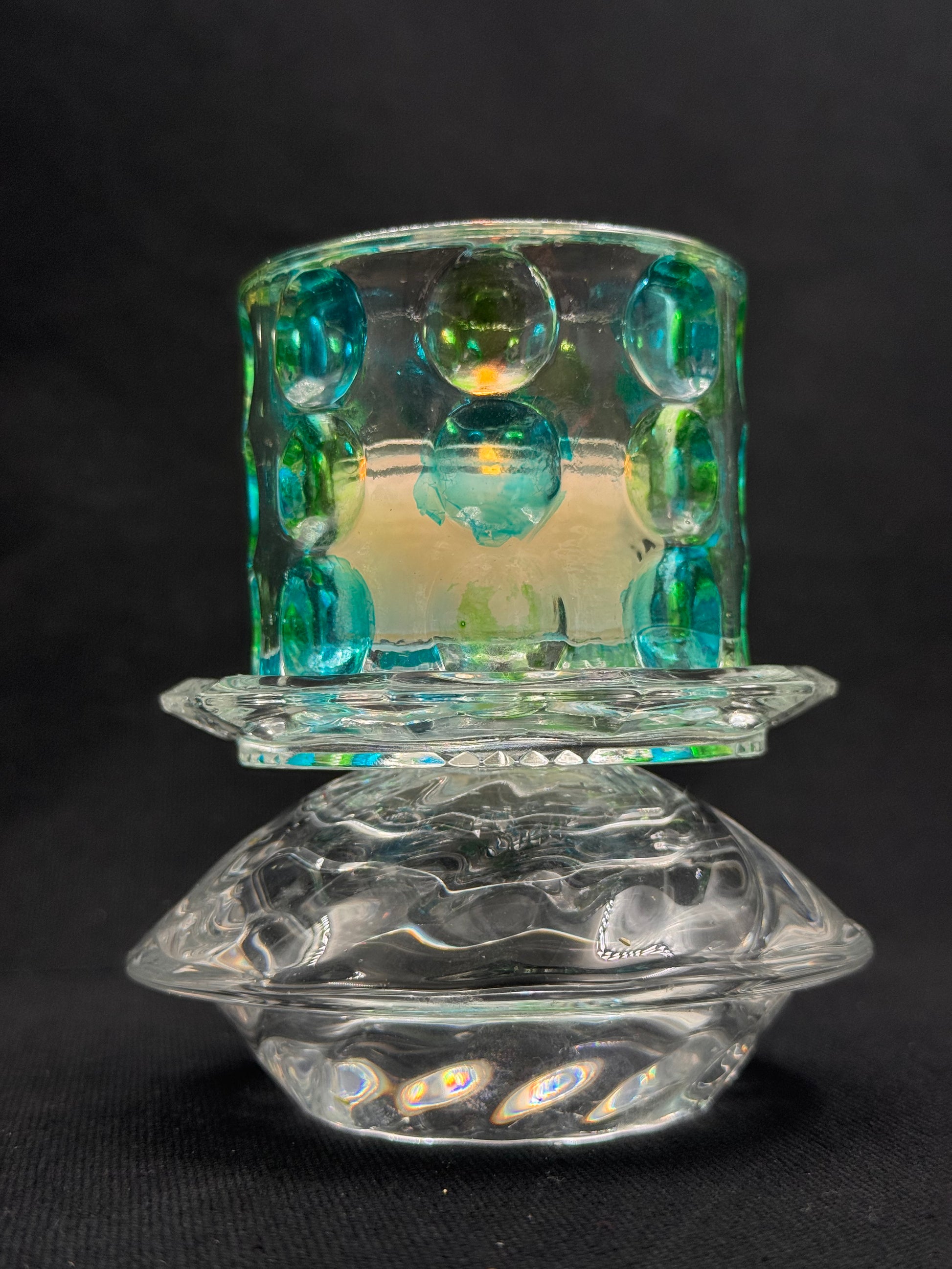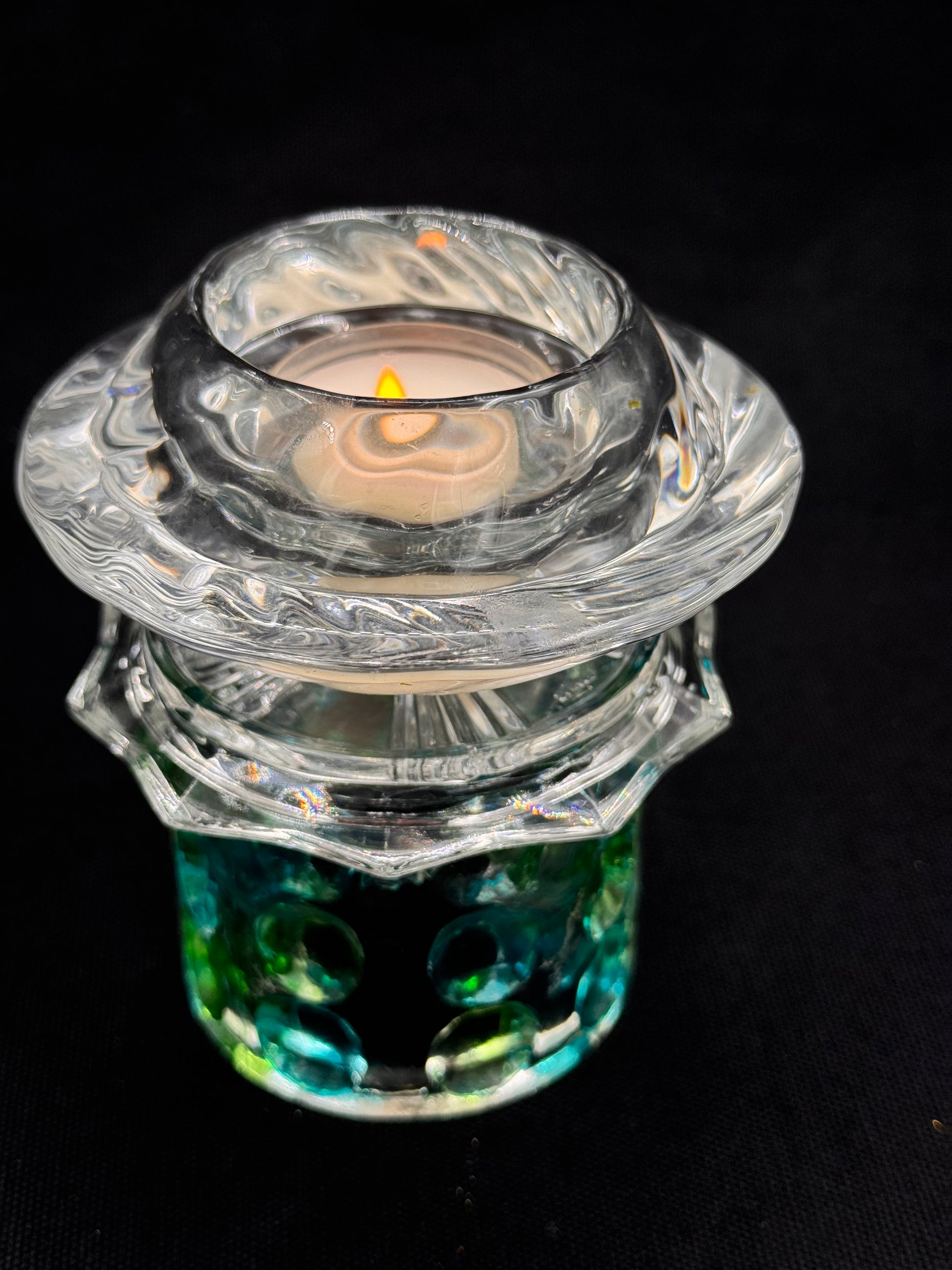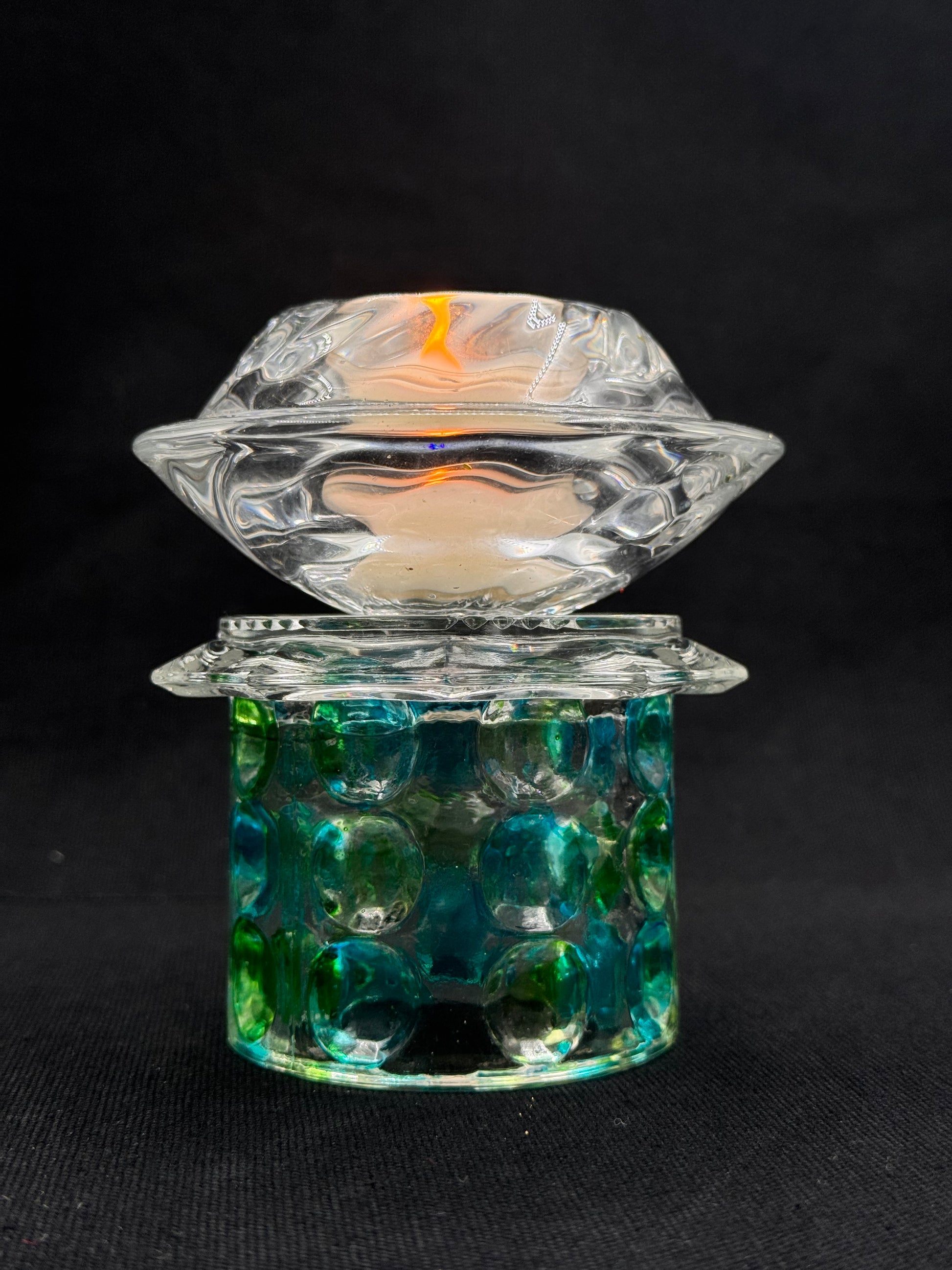 Denne lyslykten er satt sammen av kvalitetskrystall fra Royal Copenhagen. Du kan bruke lykten begge veier. Foten er en fargerik lysestake. Se bilder