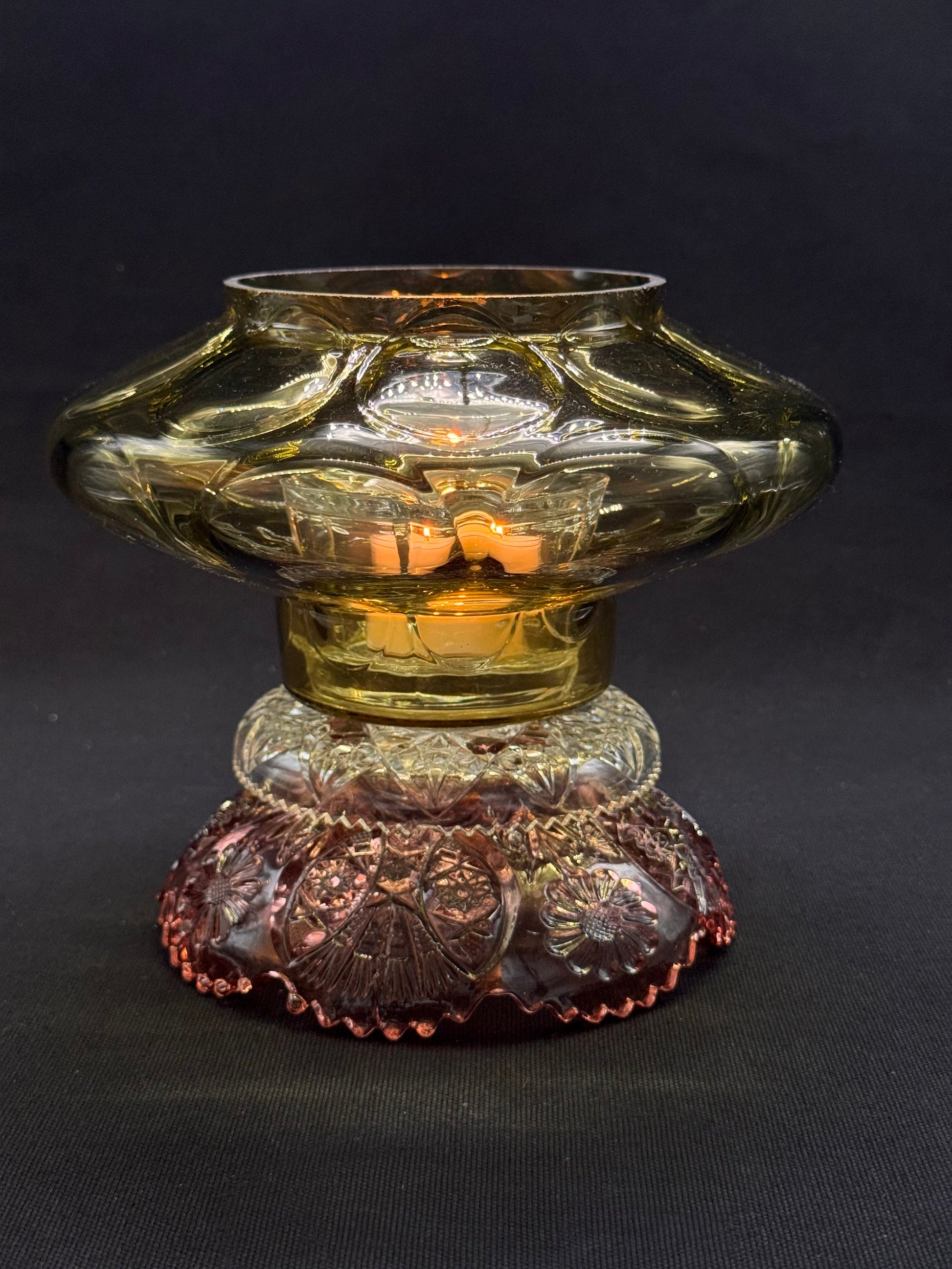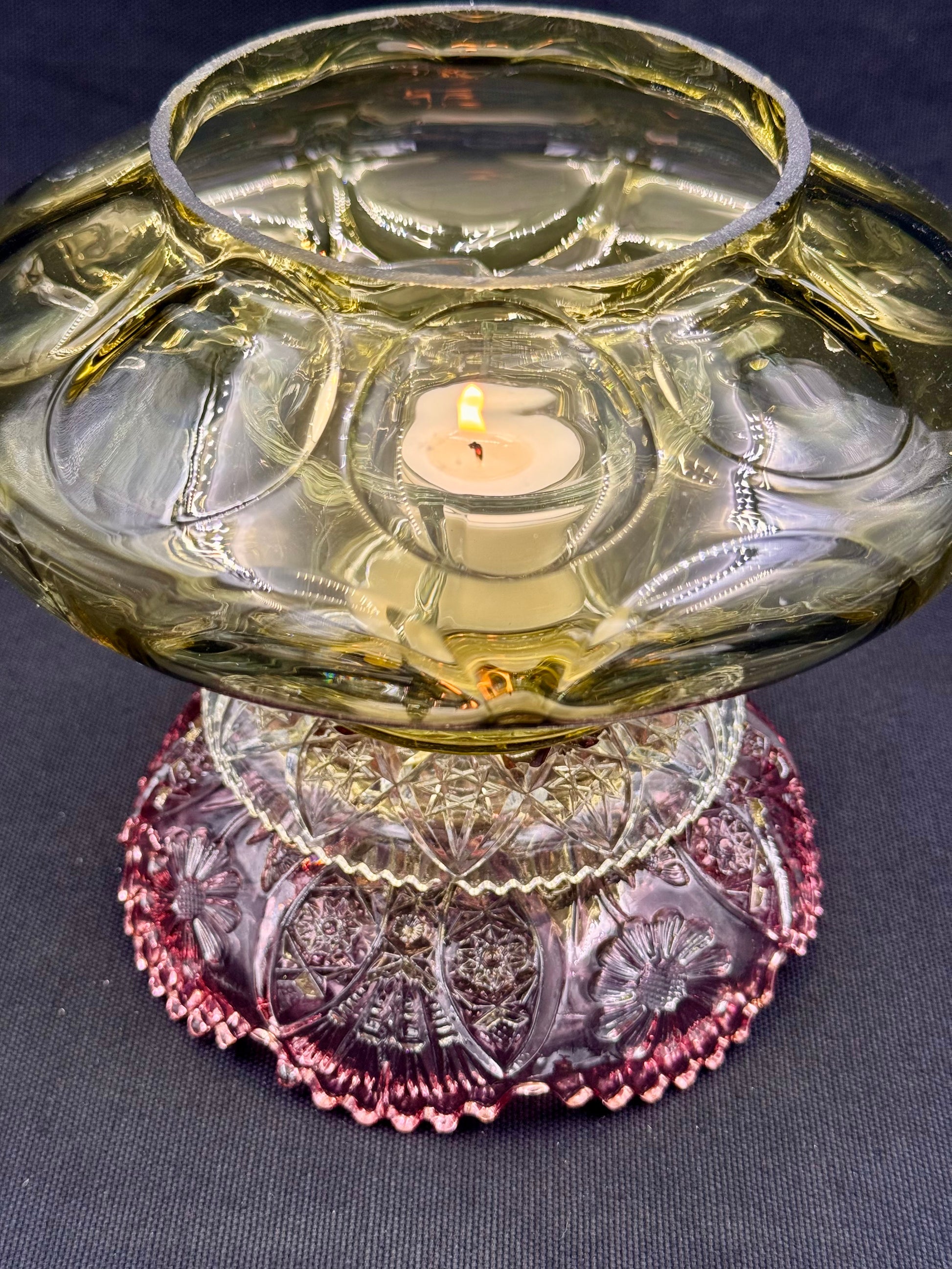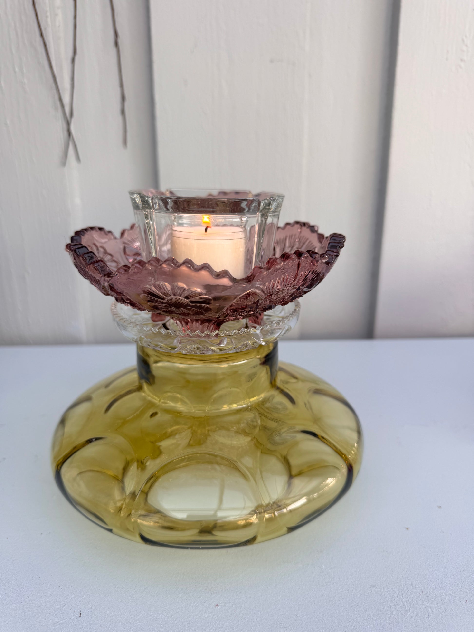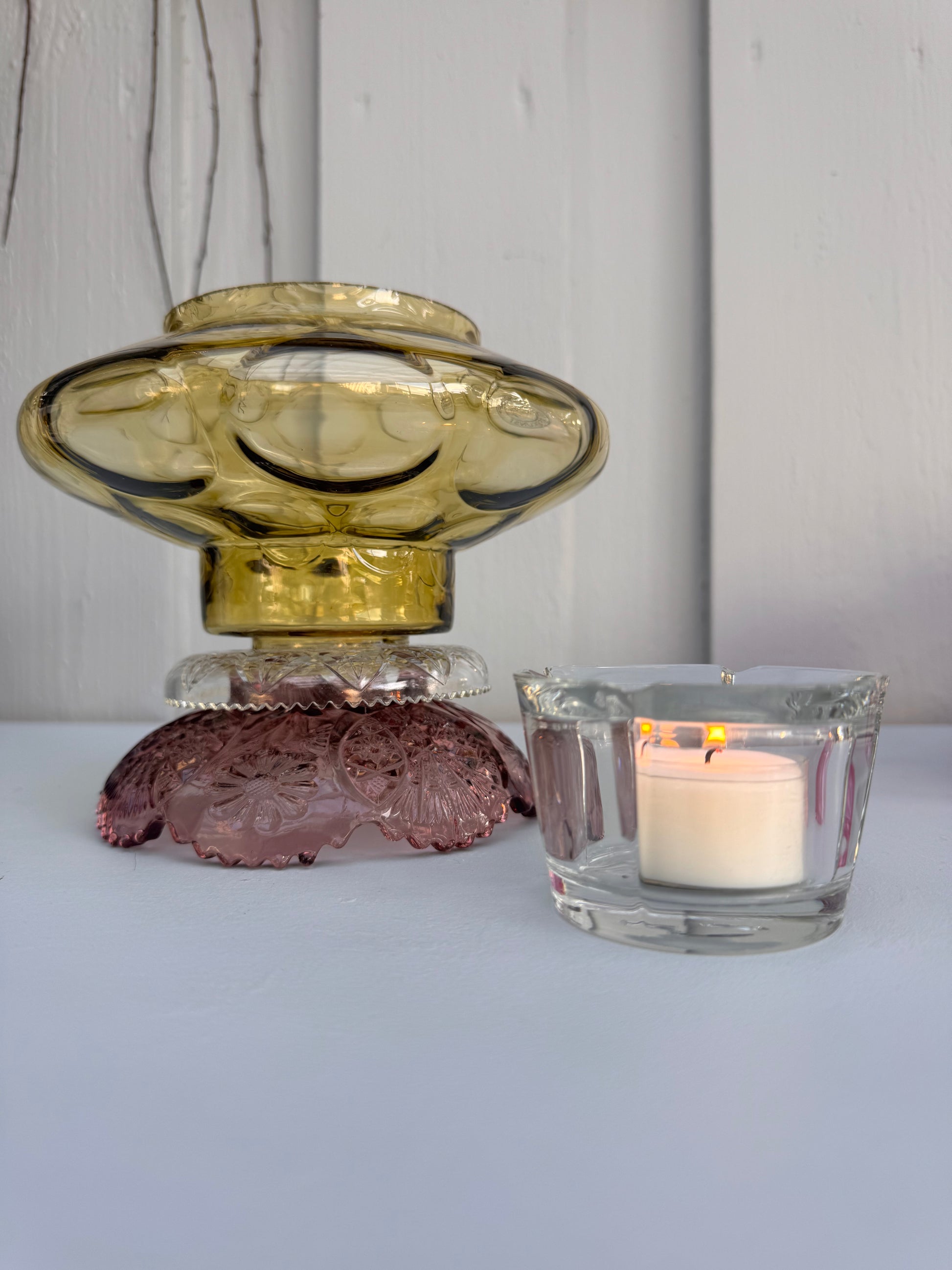 Helt unik lyslykt med en sjelden grønn kuppel. Foten er en lilla skål og kreasjonen kan brukes begge veier. En telysholder fra Rosendahl beskytter kuppelen.