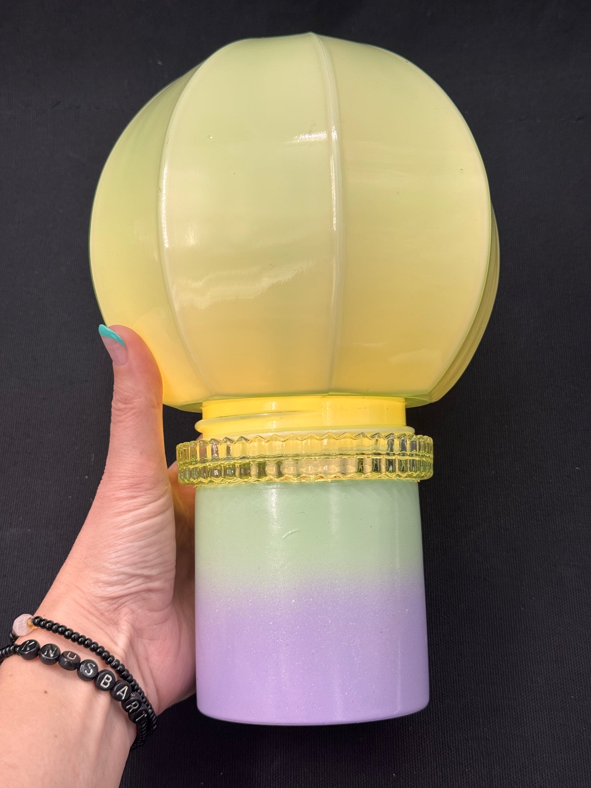 Pastellhimmel💃 Foten er malt i grønt og lilla. Kuppelen er mintgrønn. Vi har toppet med sølvglitterglitter på foten.