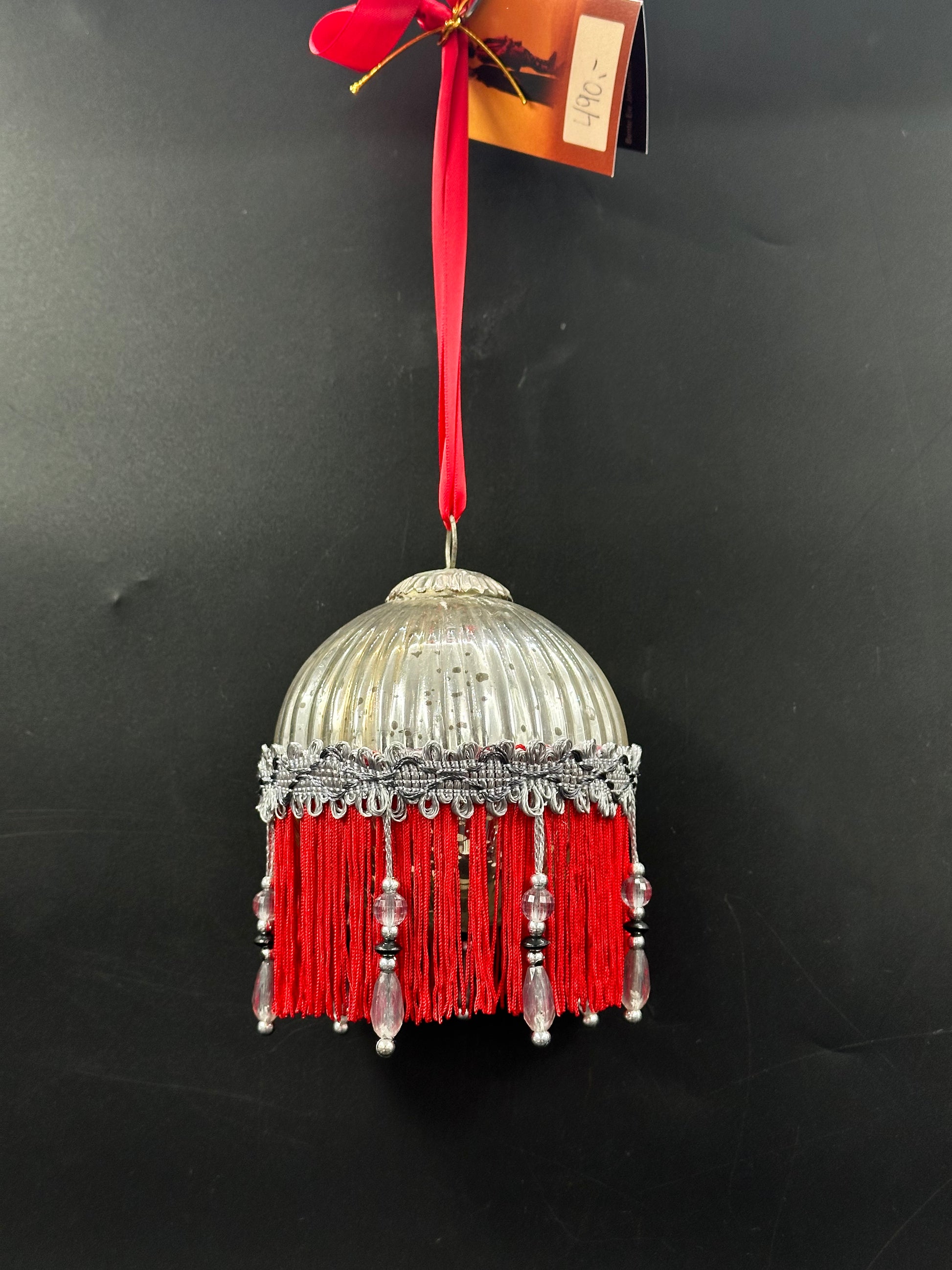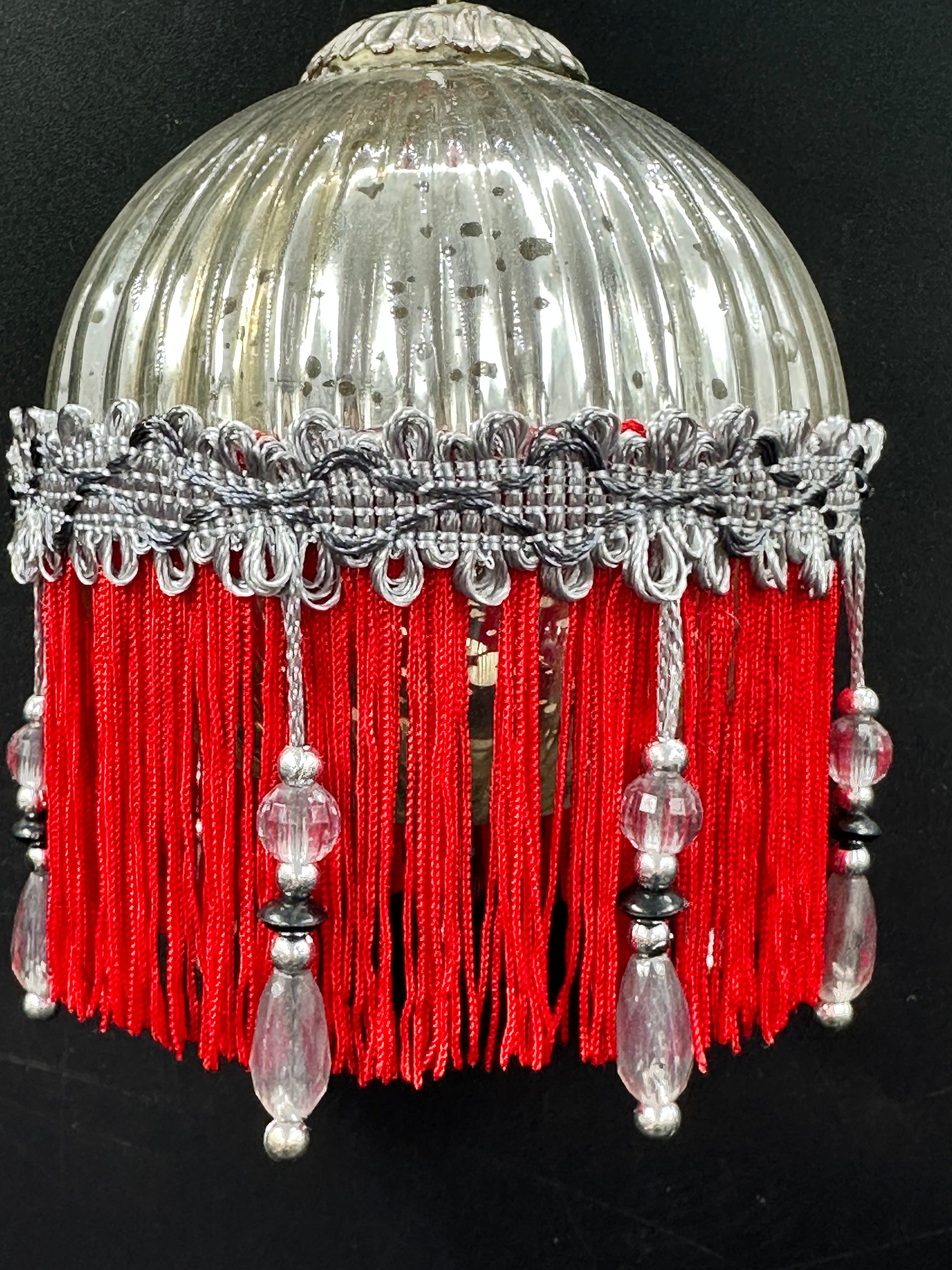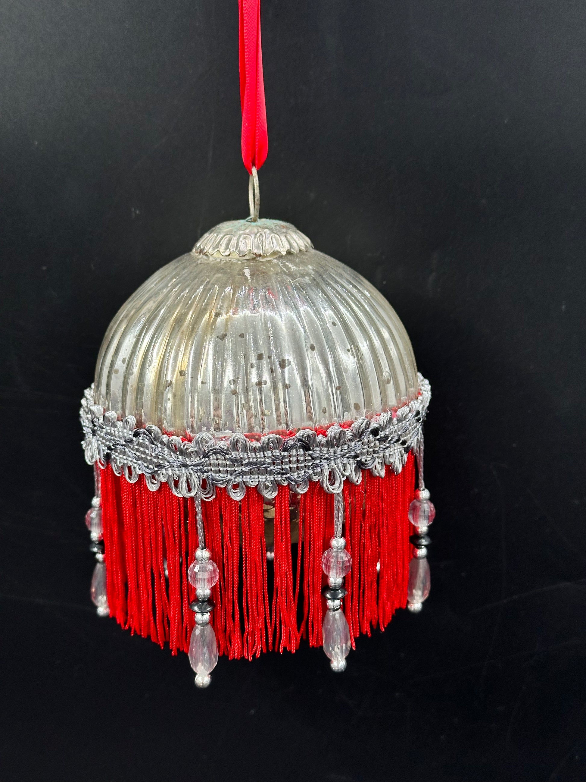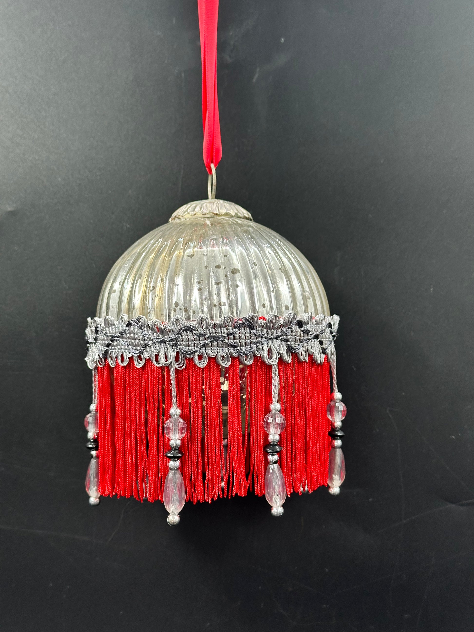 Julekule i glass pyntet med røde frynser og grå perler. Julekulen henger i et knallrødt silkebånd. Lekker i et vindu og på en gren. Den er altfor stor til juletreet. Se bilde