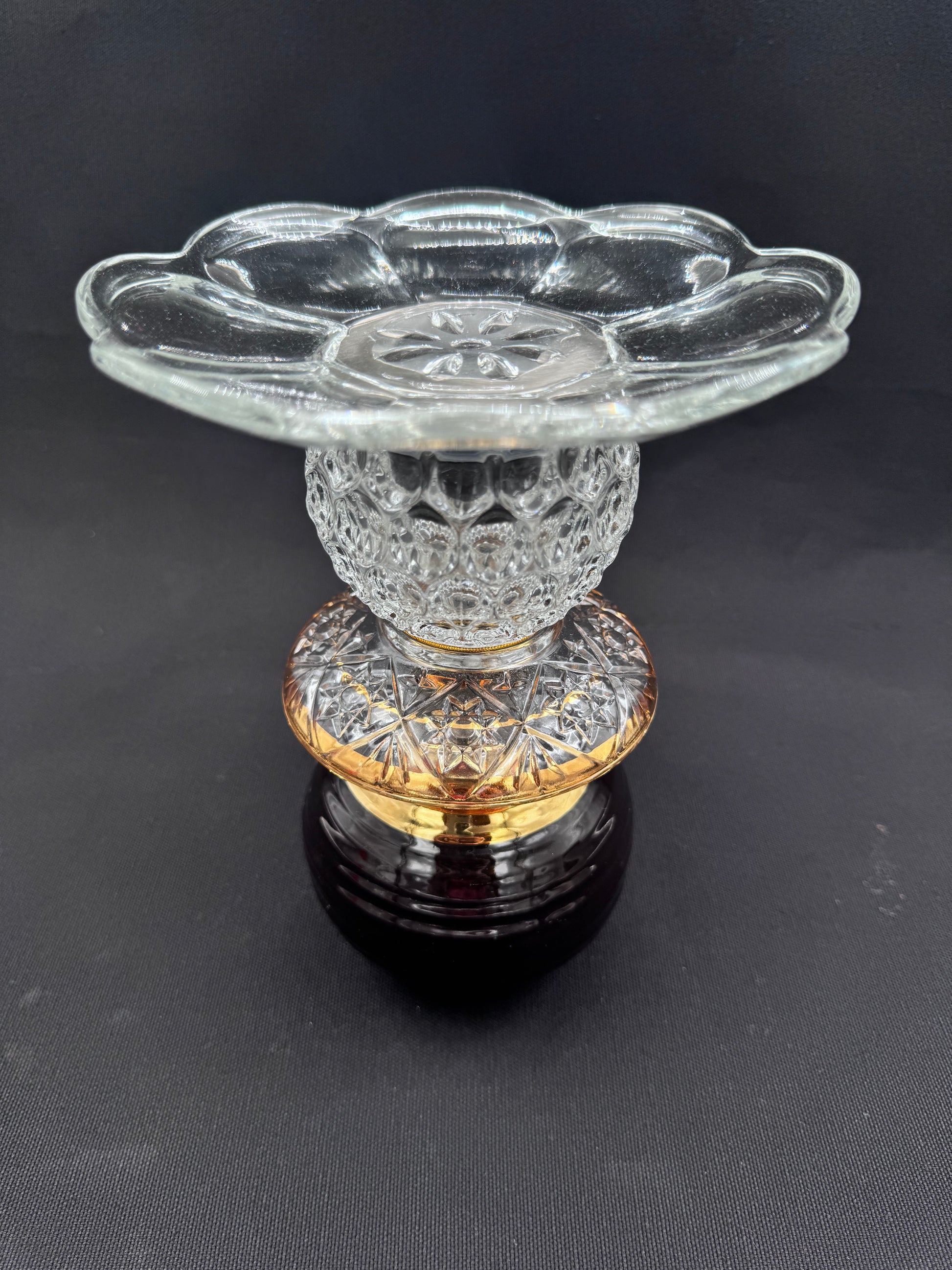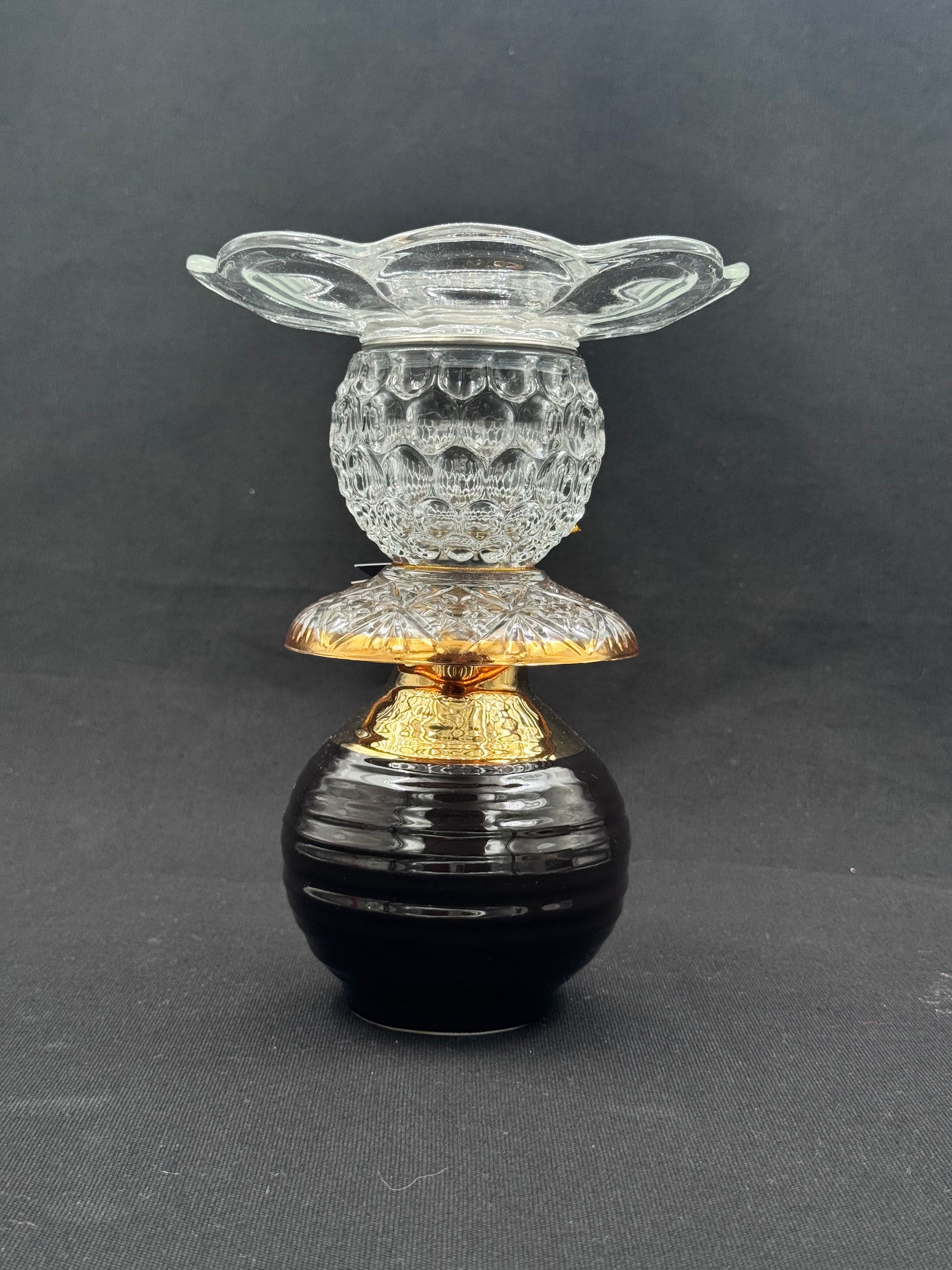 Mini Solcellelampe svart fot og gullkrave, blomsterfat på toppen.