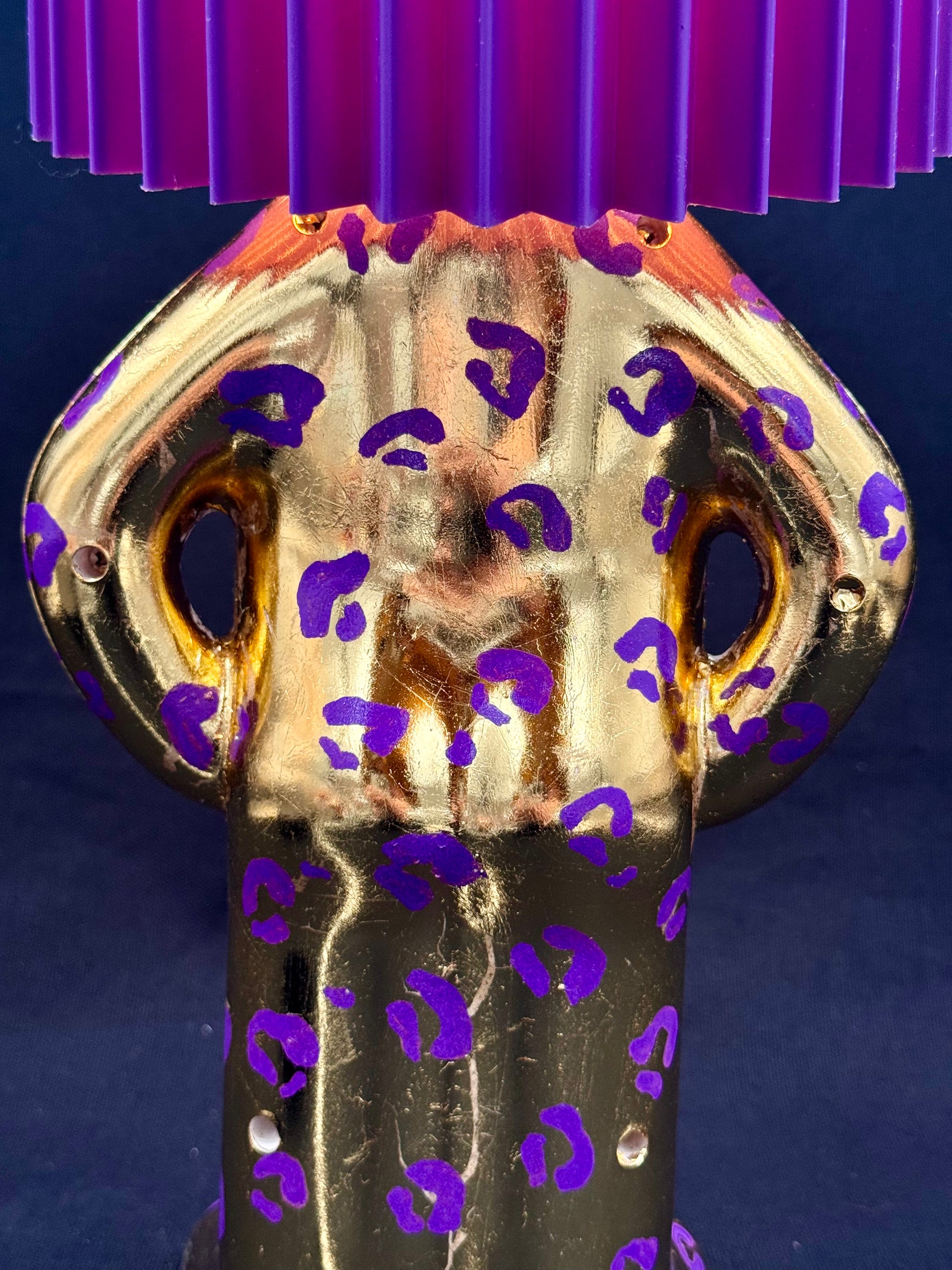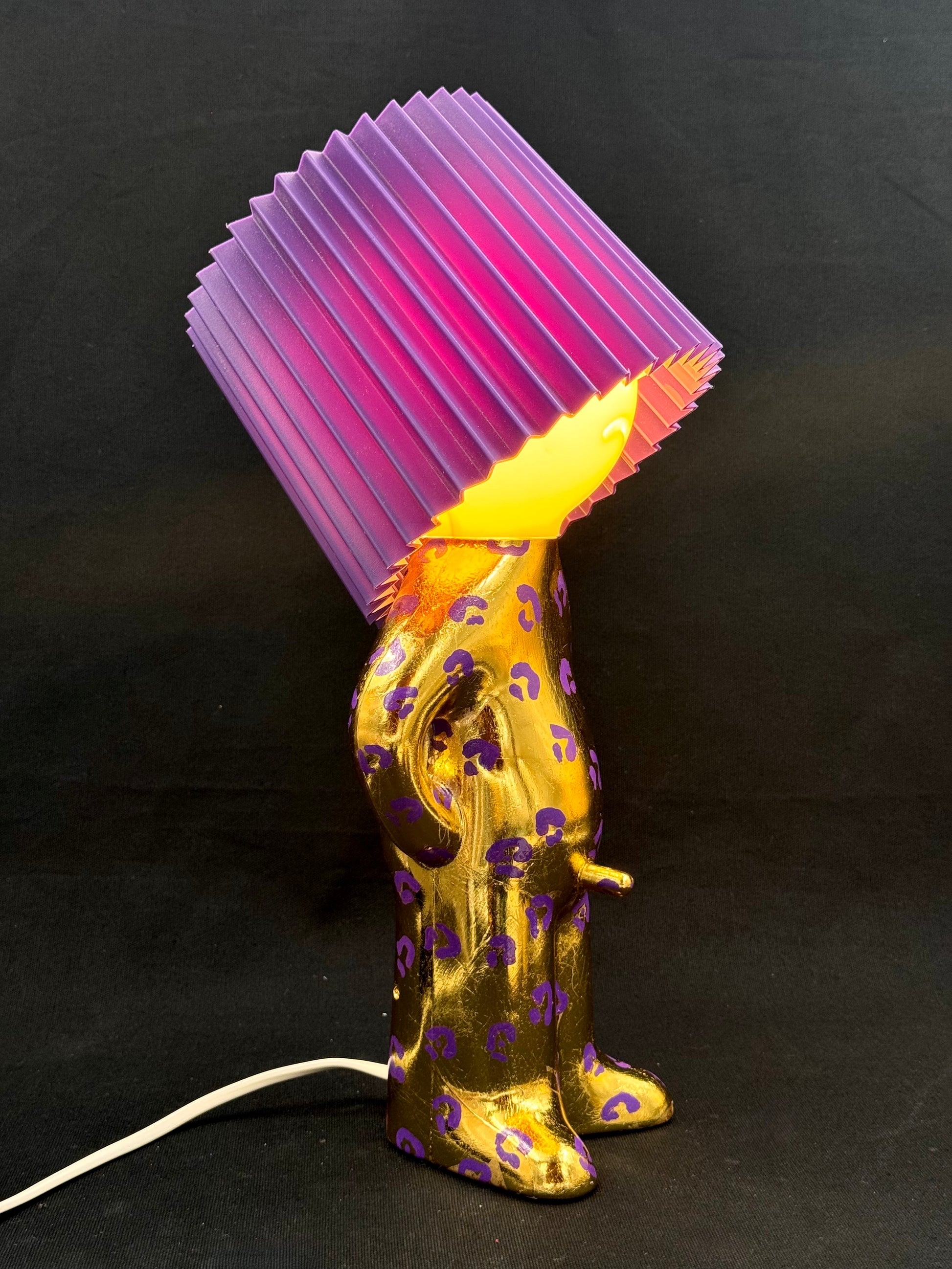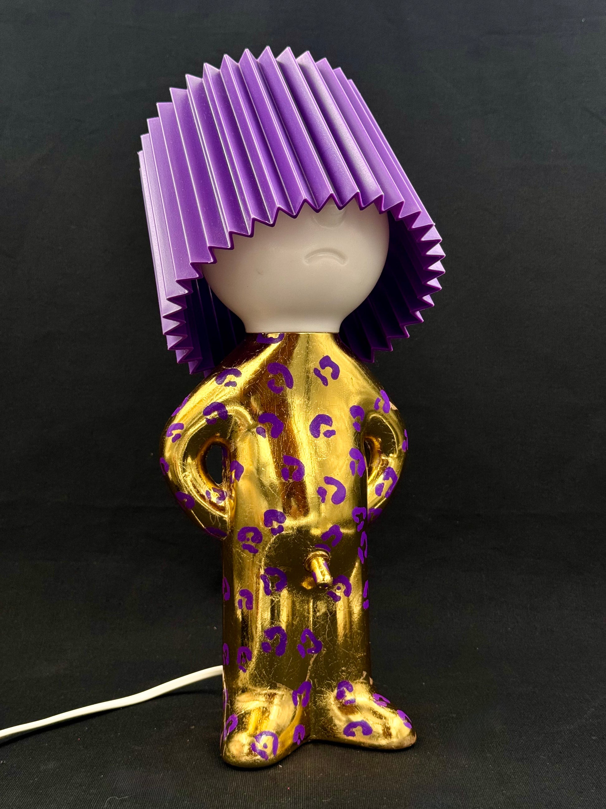 2. Mr P i shiny gull og lilla leomønster med lilla skjerm