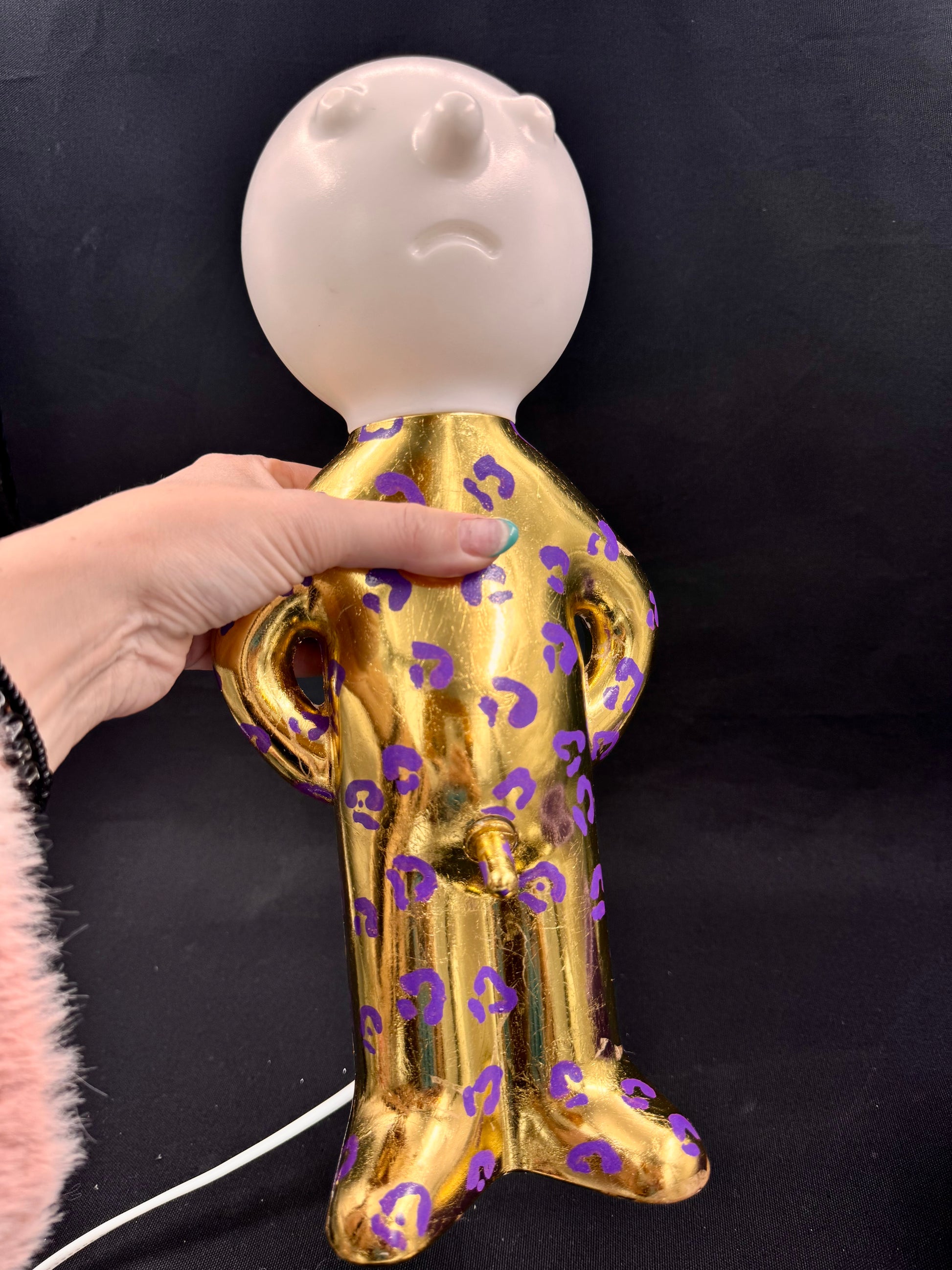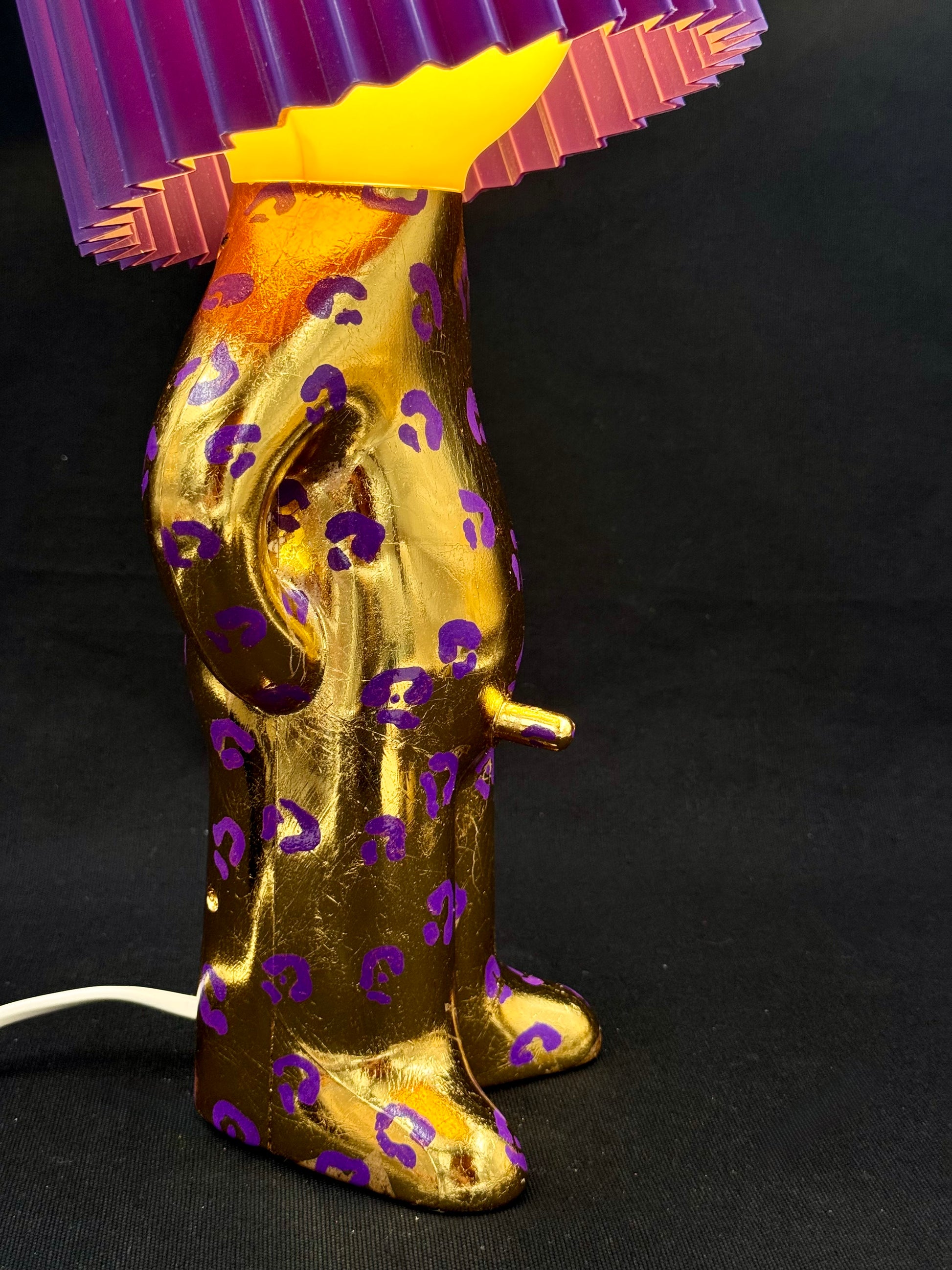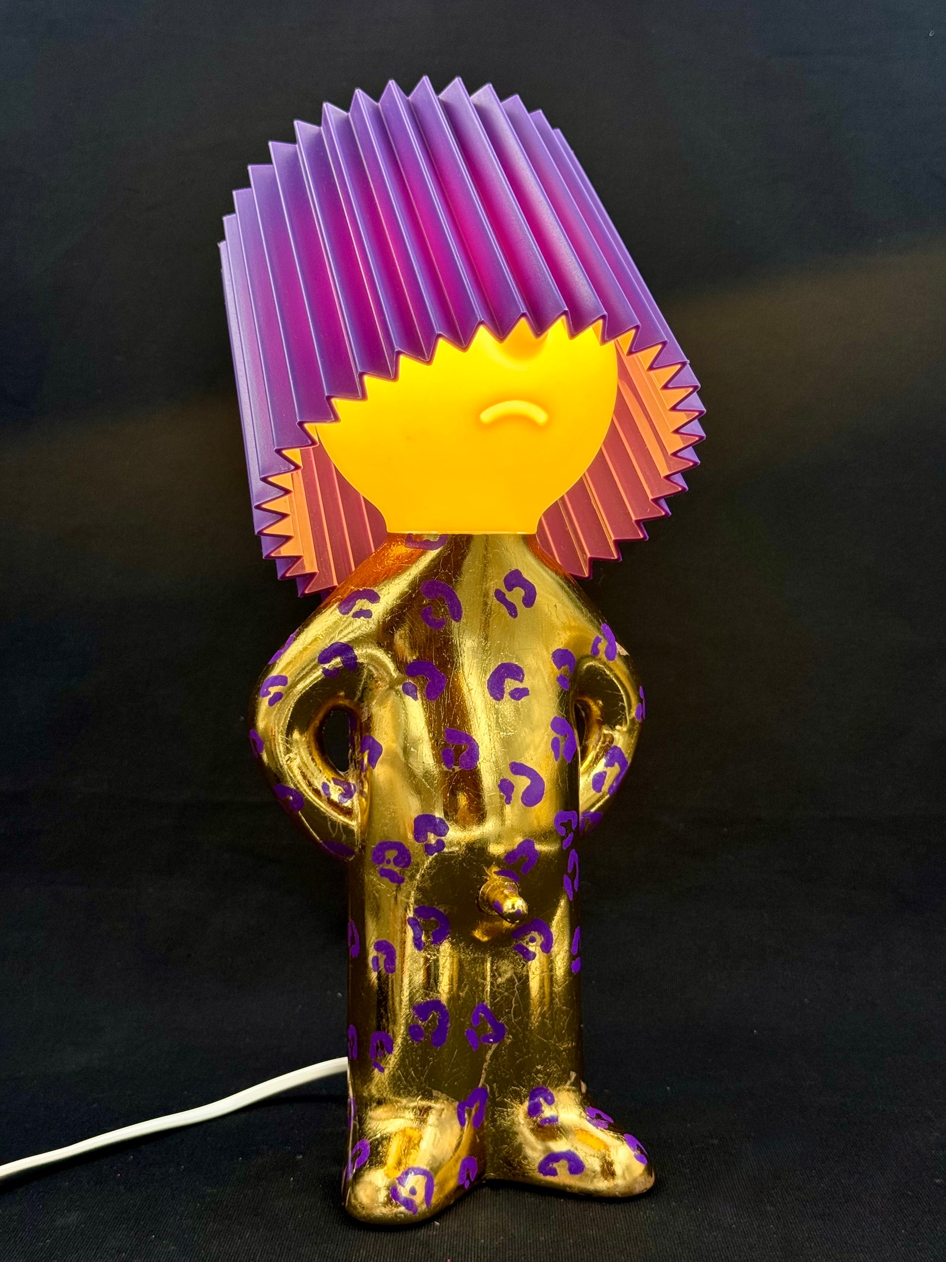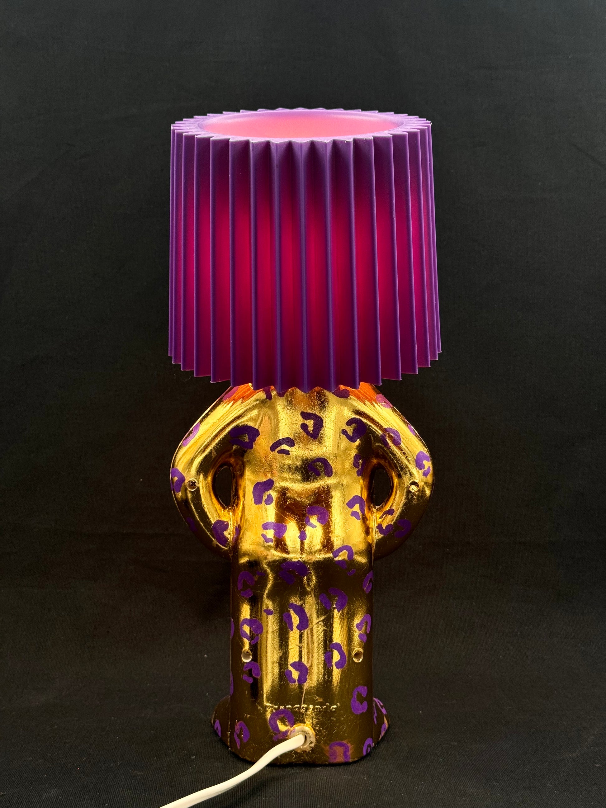 2. Mr P i shiny gull og lilla leomønster med lilla skjerm