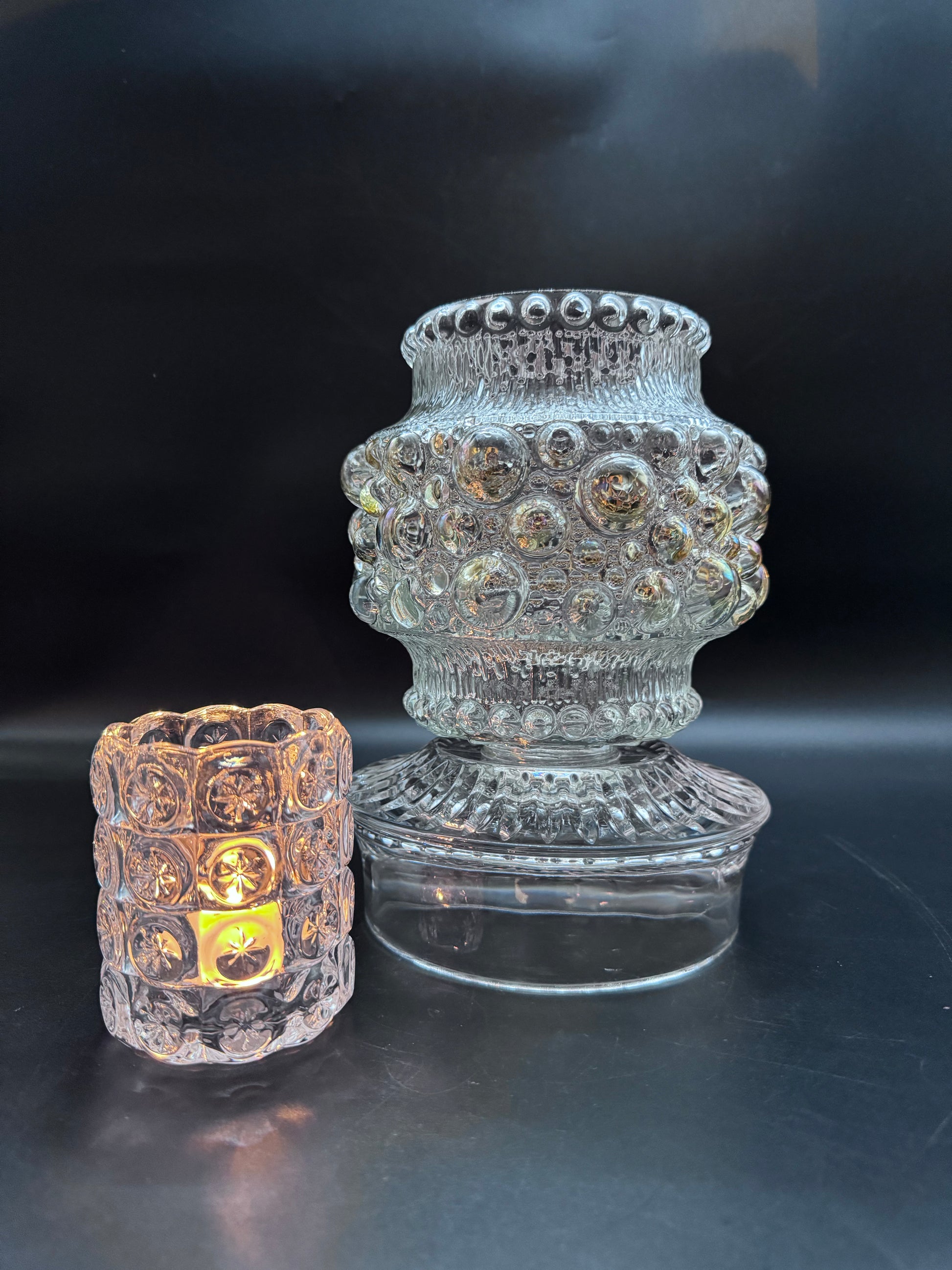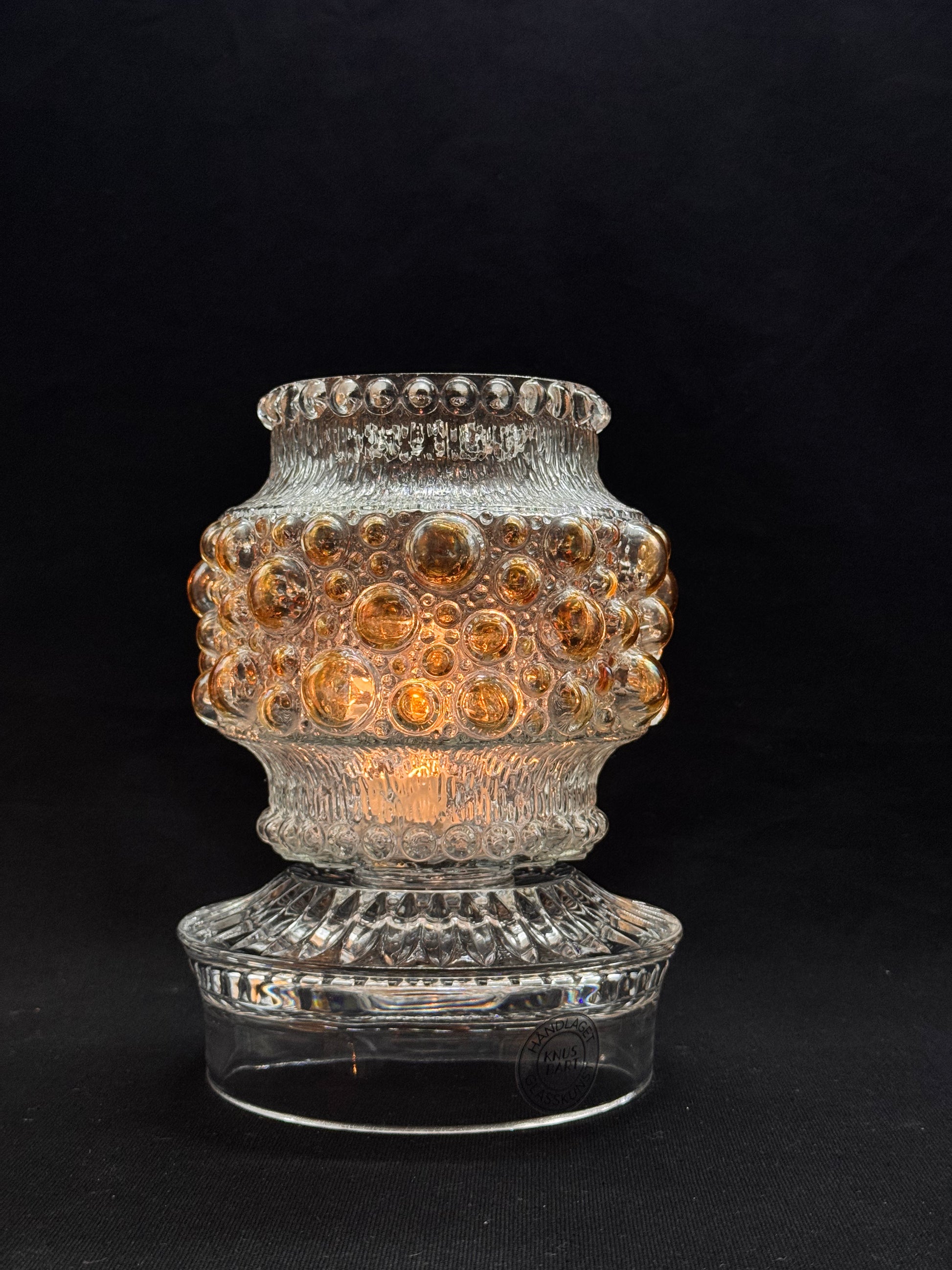Lyset skinner så fint gjennom den mønstrede glasskuppelen. Vi har plassert en ekstra telysholder i glasskuppelen for å beskytte den for søl.