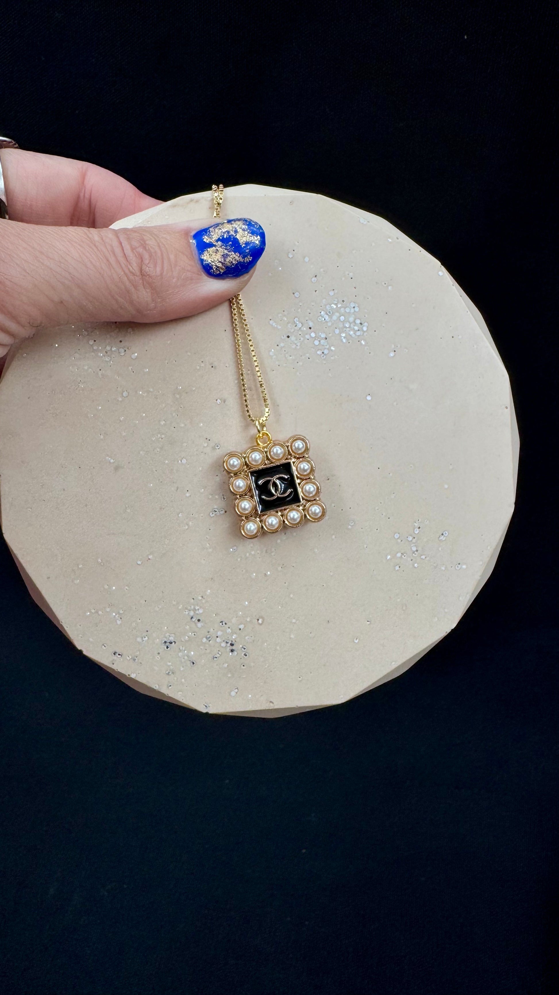 Vintage Chanel smykke svart/gull og perler i firkantet form