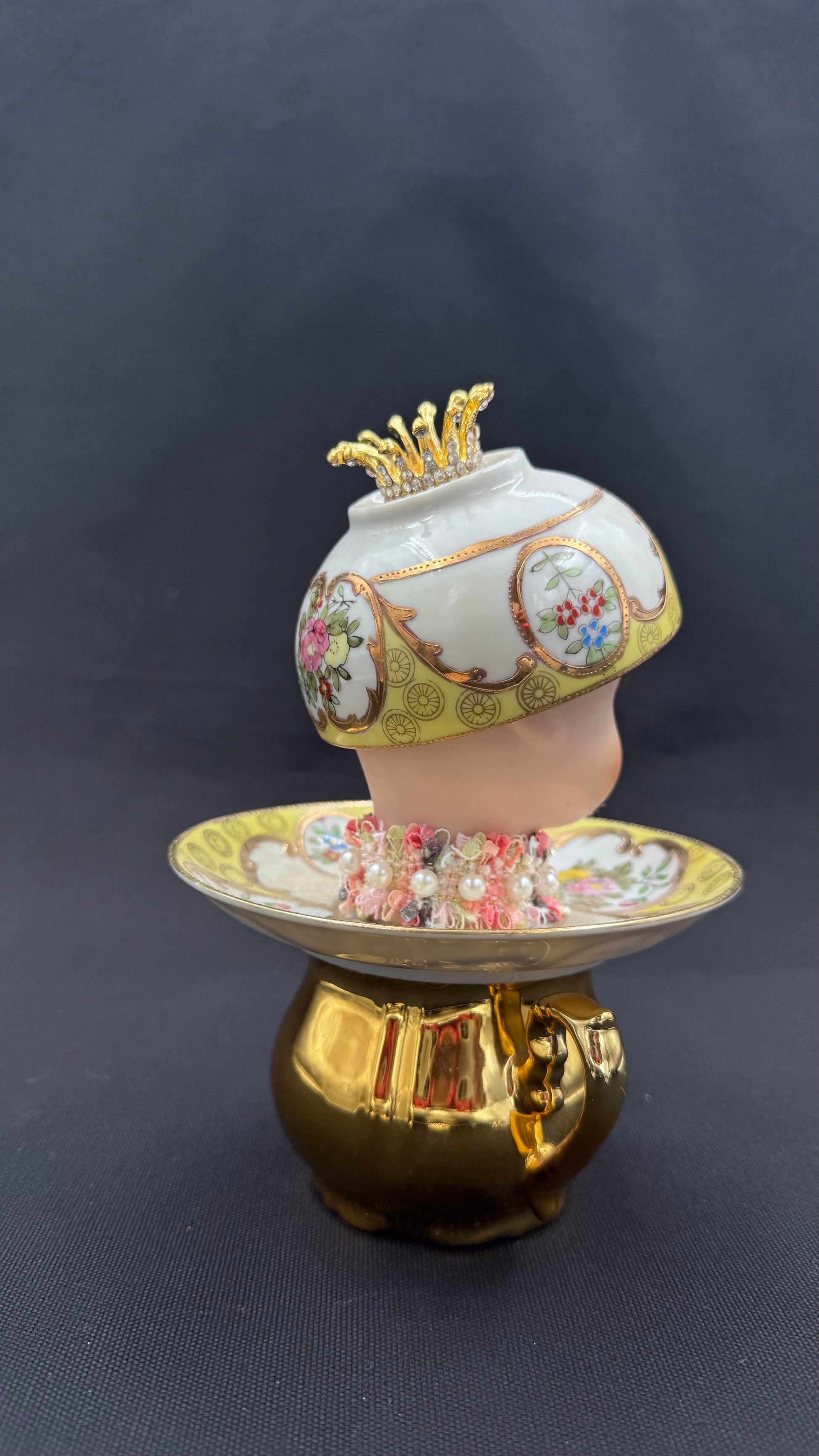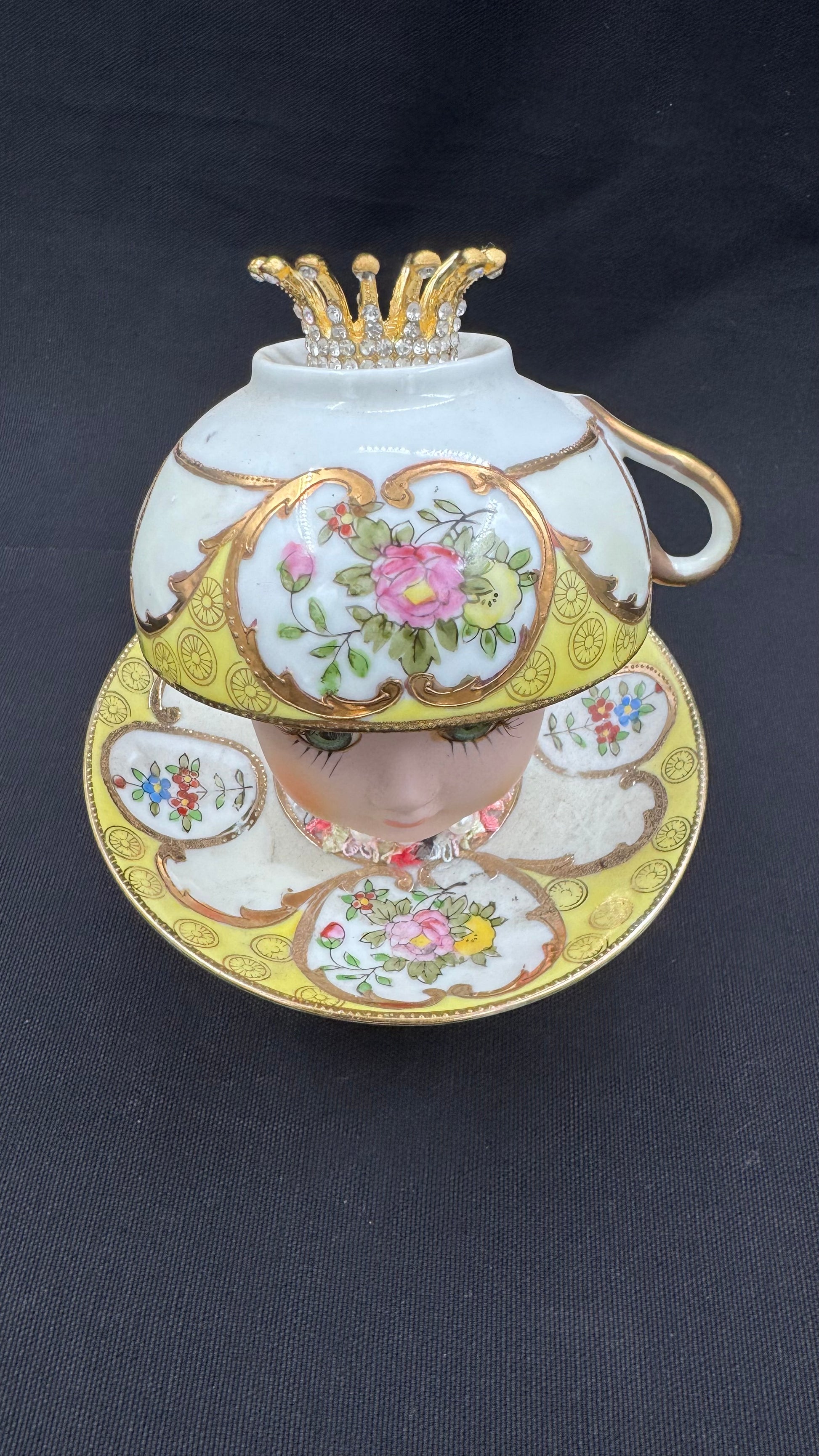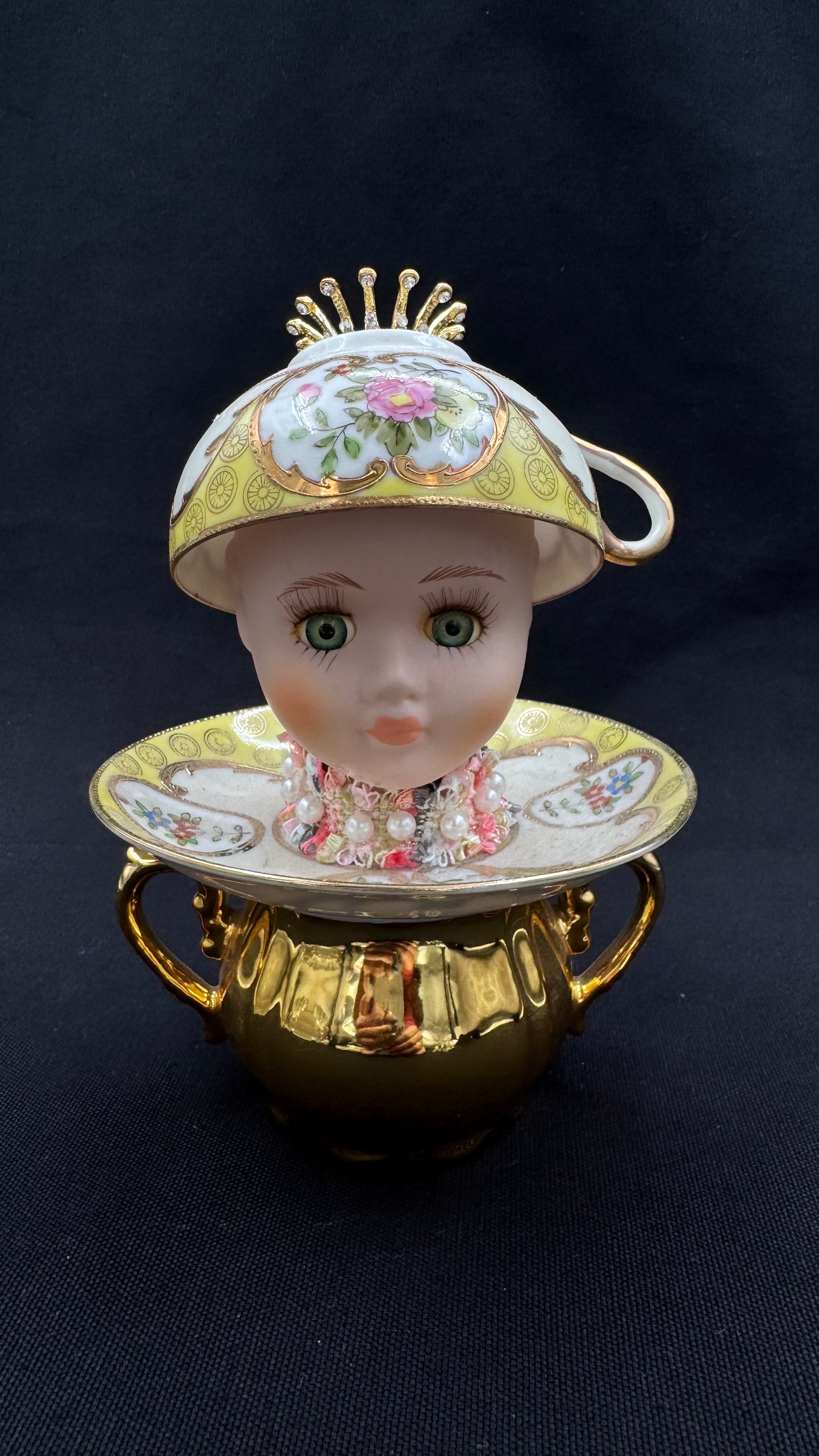 Nydelig dukke stående på en sukkerskål og koppesett i gult med rosa blomster. Hun har selvsagt en krone i gull på hodet. Brukes som pynt eller til smykker på badet.