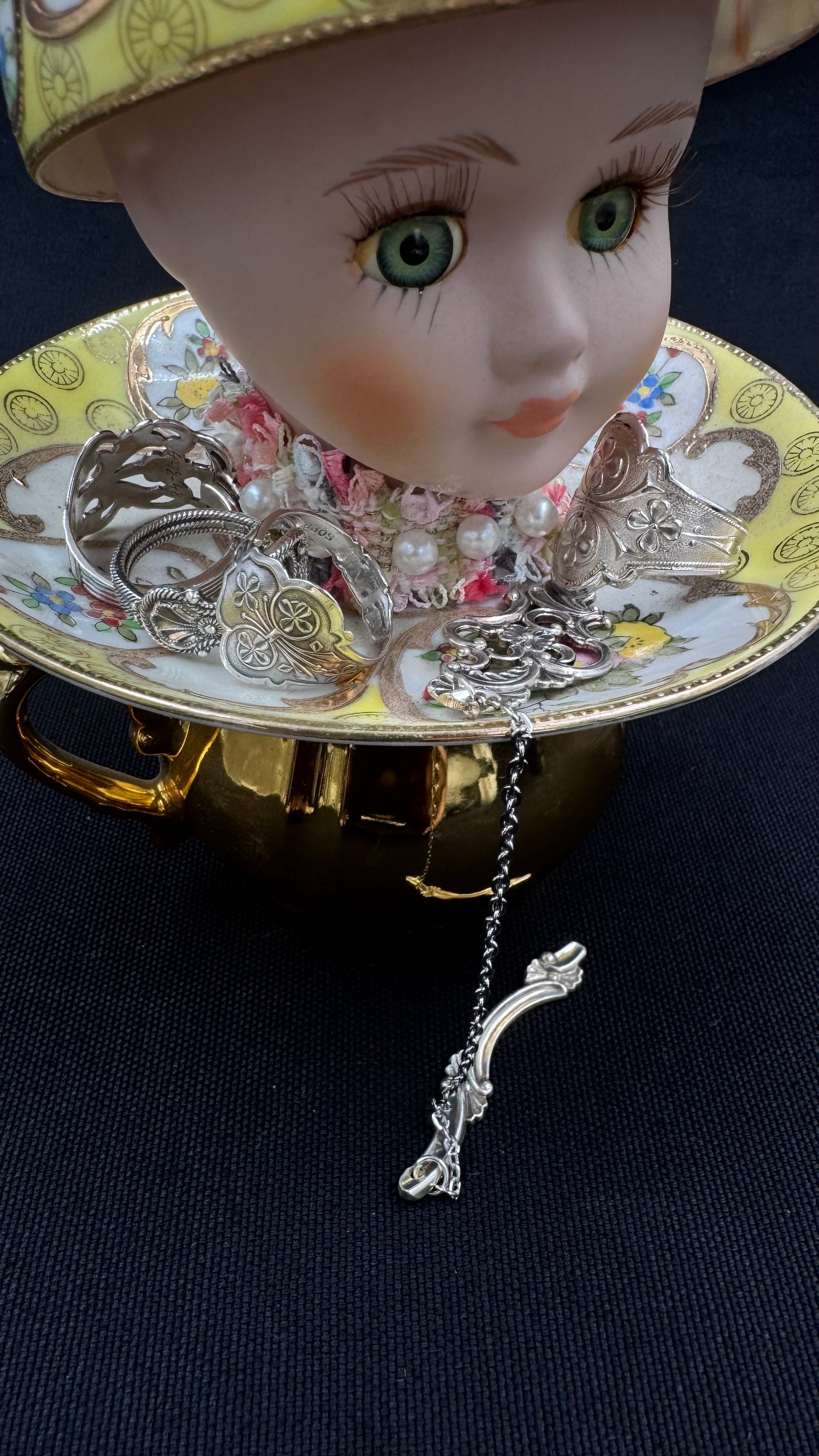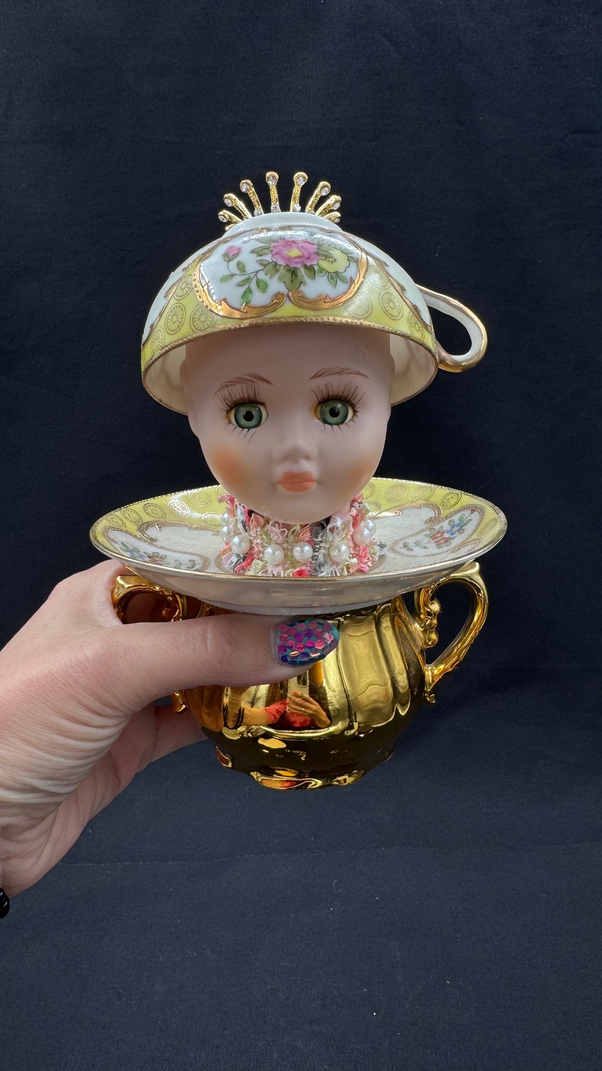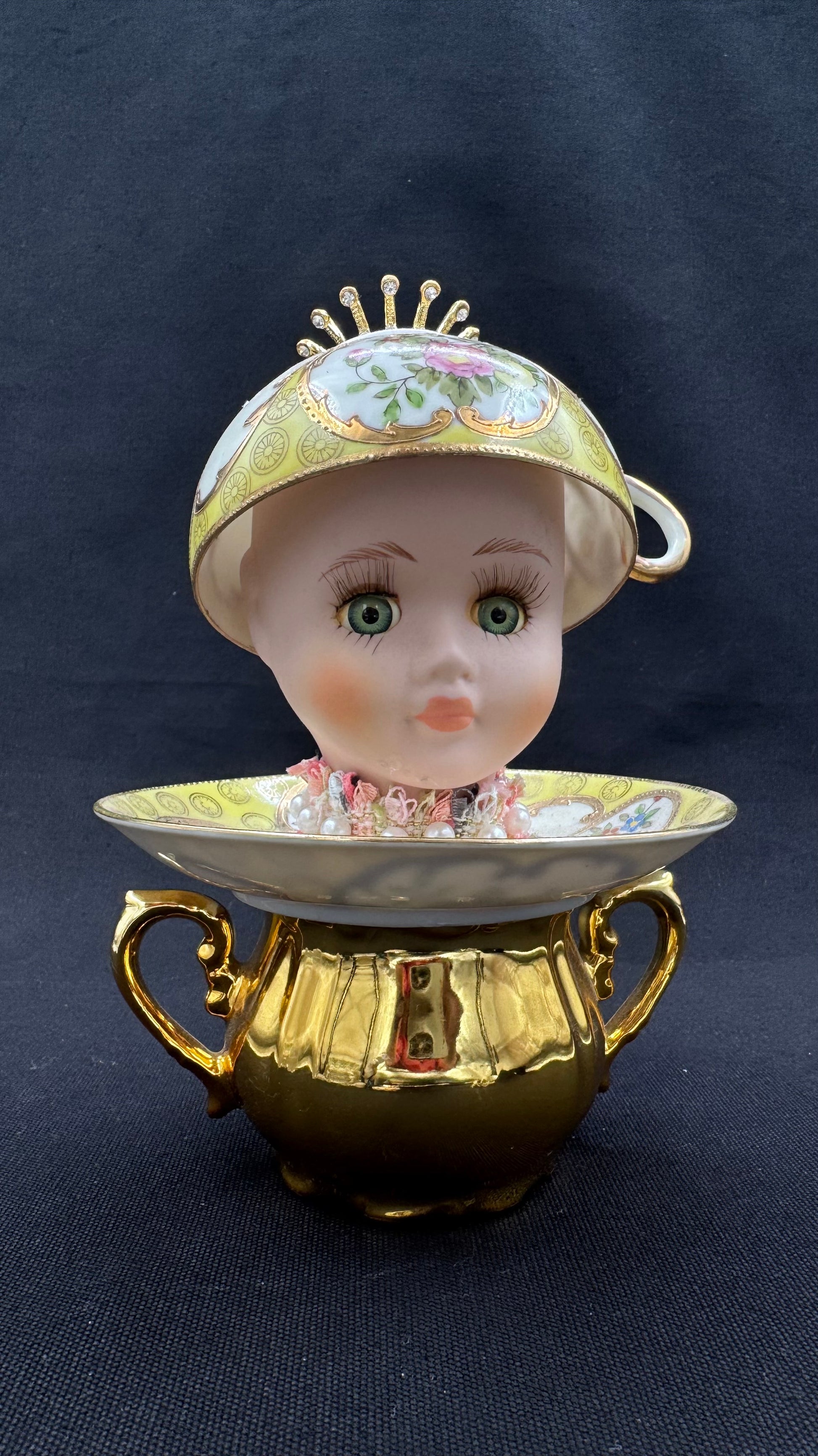 Nydelig dukke stående på en sukkerskål og koppesett i gult med rosa blomster. Hun har selvsagt en krone i gull på hodet. Brukes som pynt eller til smykker på badet.