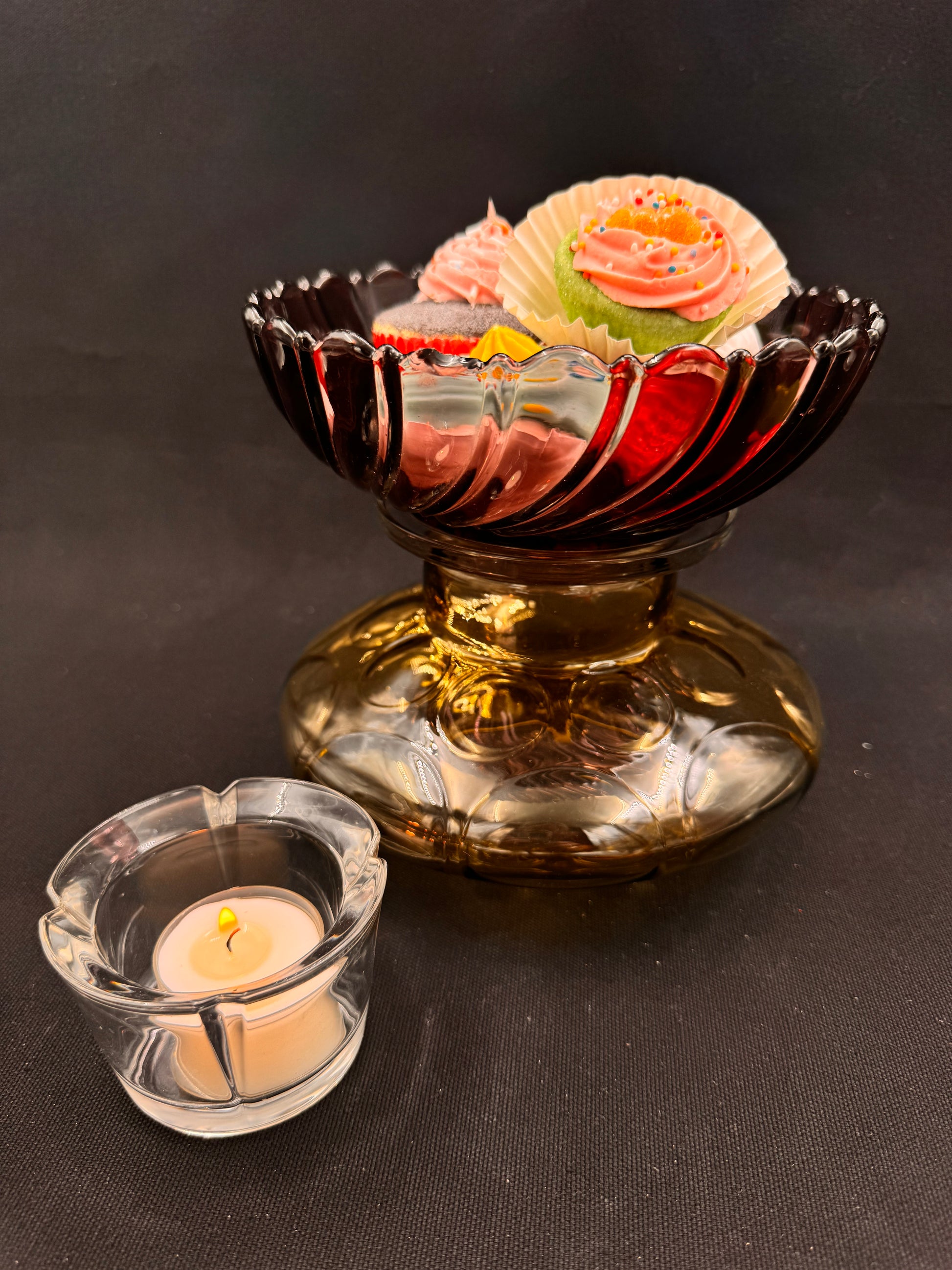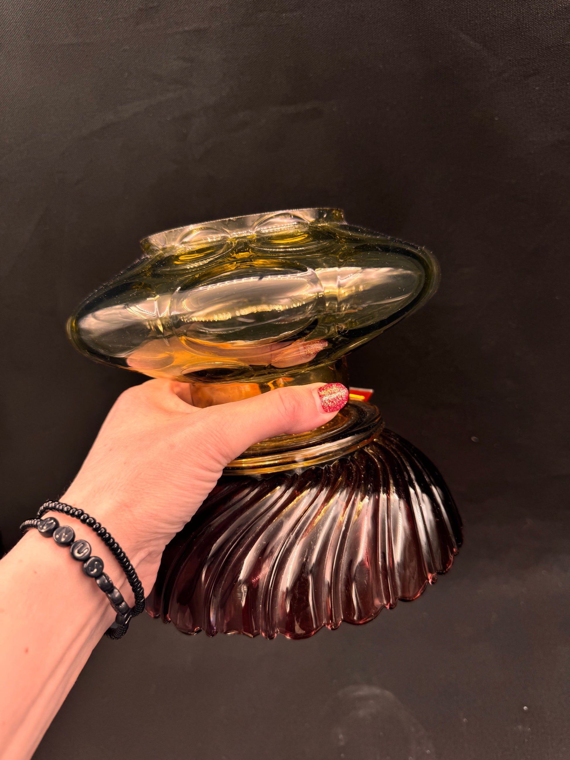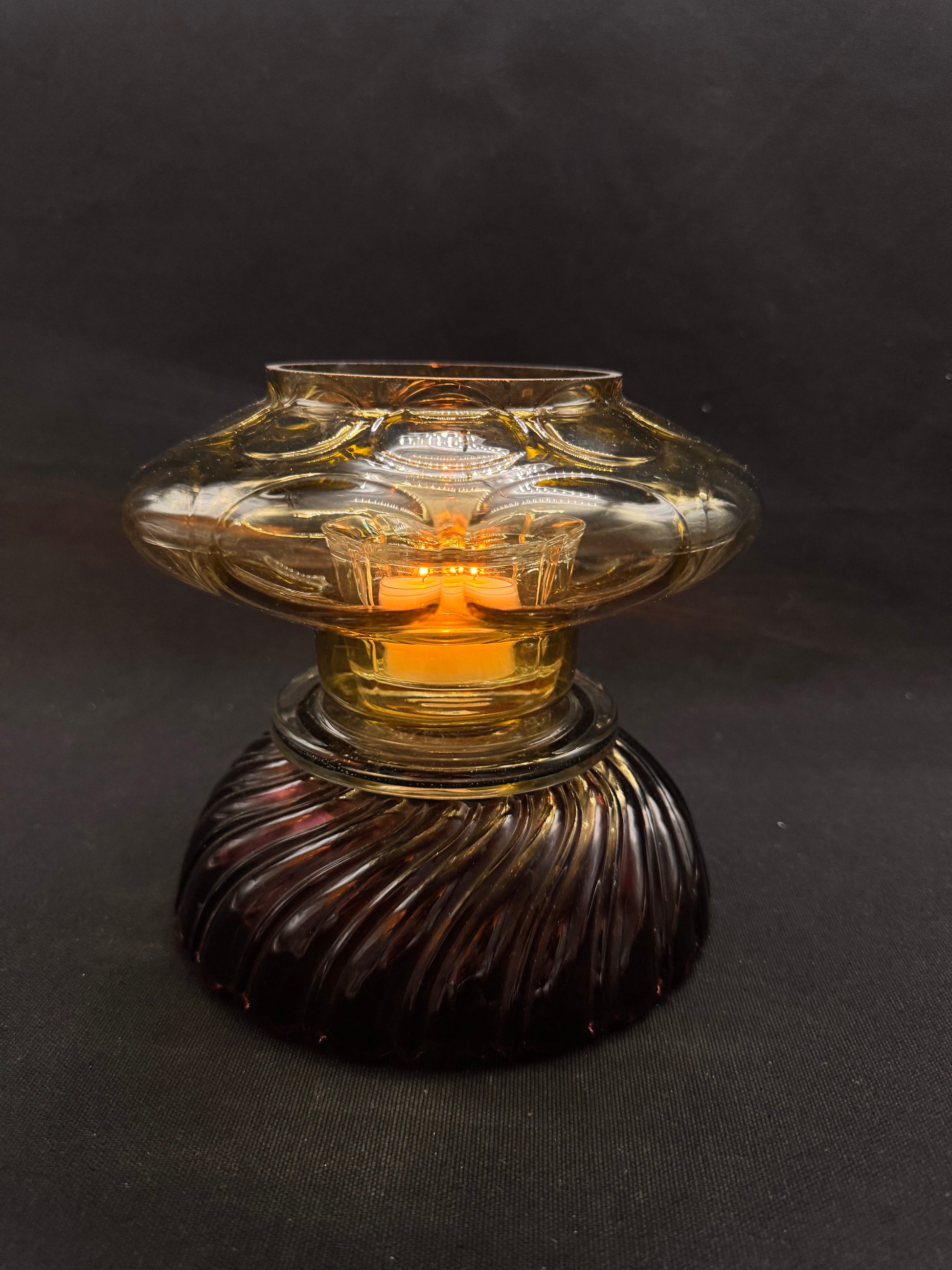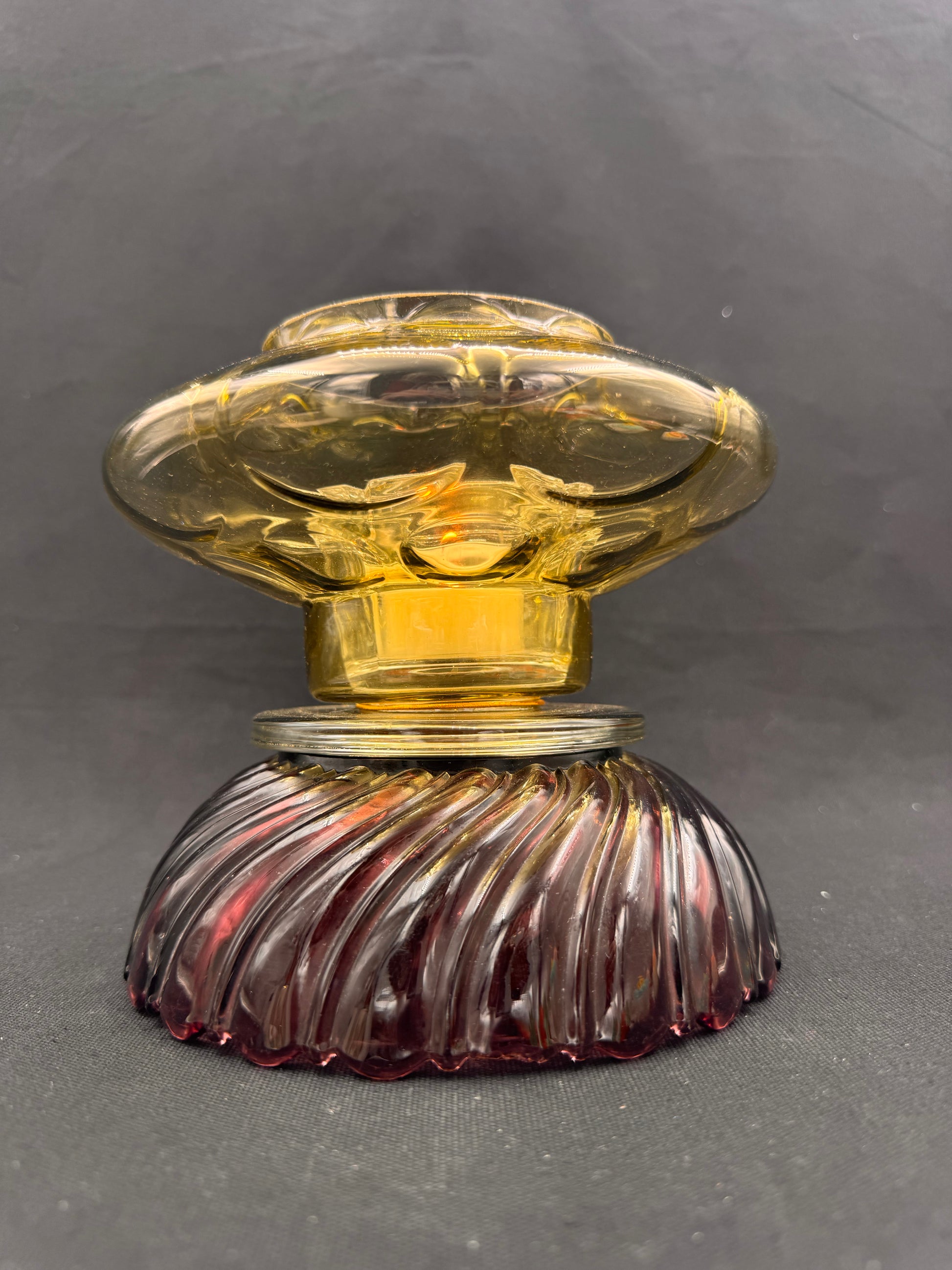 Denne er til deg som elsker det unike og sjeldne. Kuppelen kommer fra en lysekrone og foten er en lilla skål. Fargene harmonerer perfekt med hverandre.