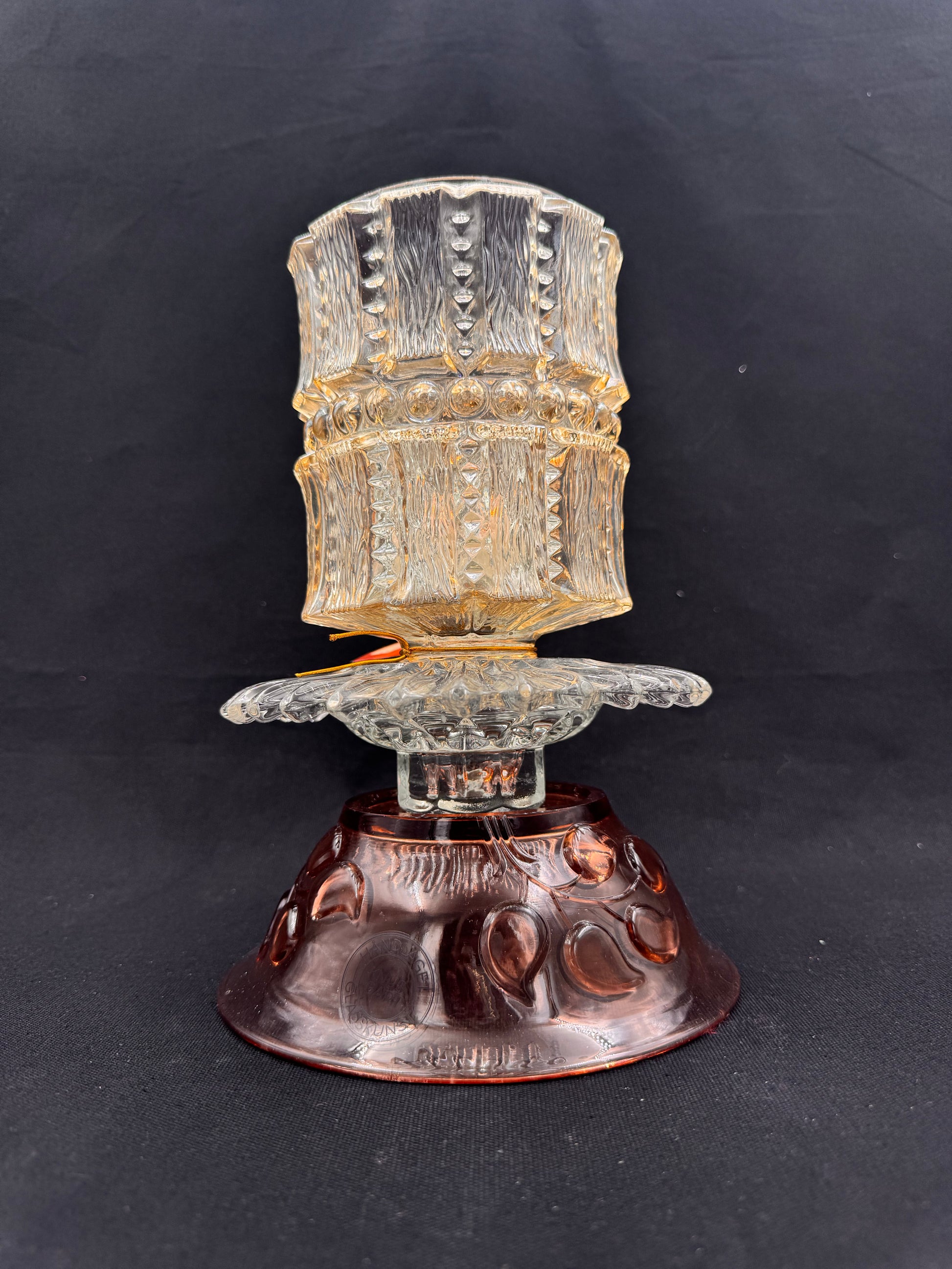 Vintage lykt i champagnefarge og krystallskål i rosa