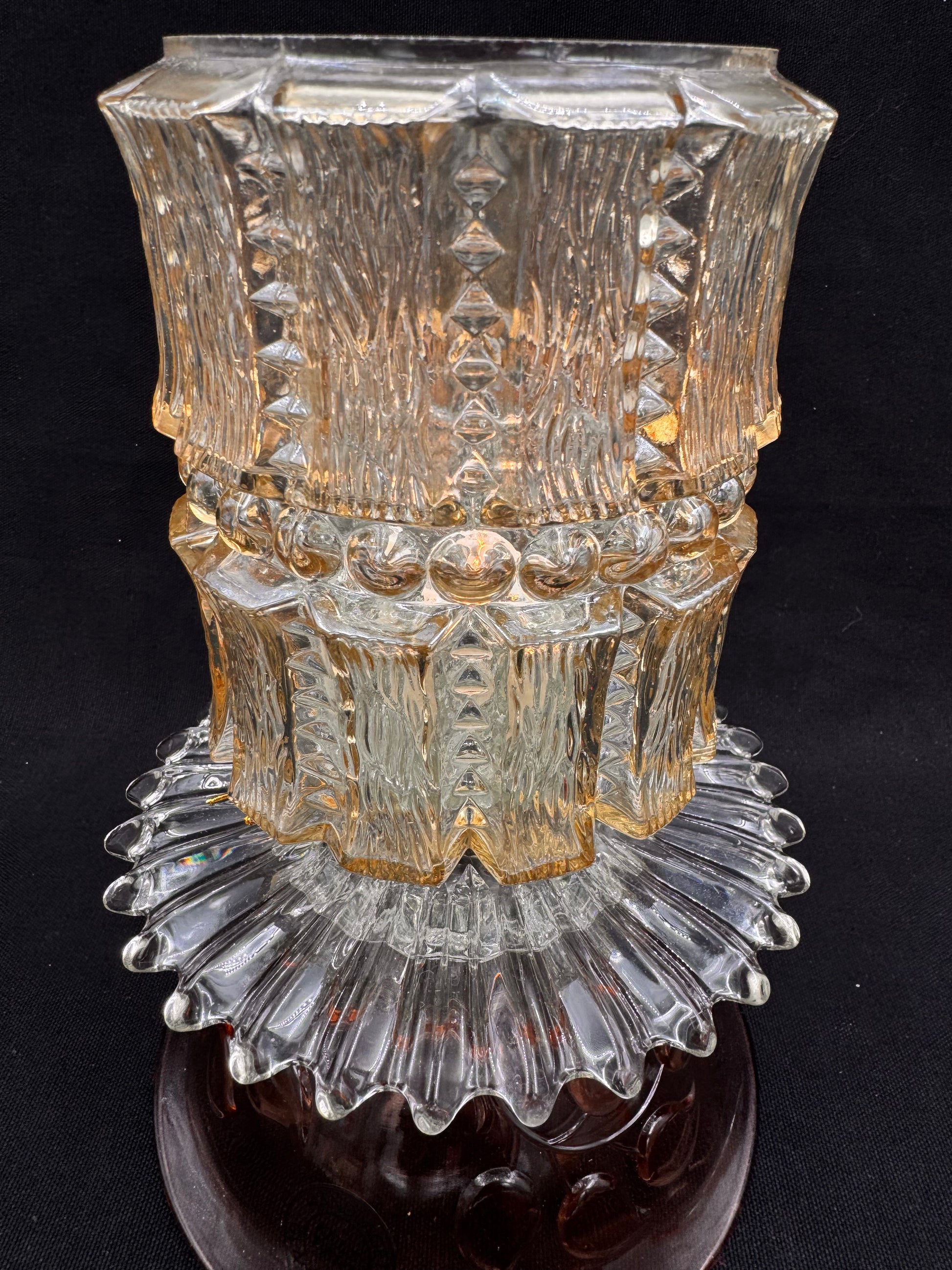 Fargen er champagnefarget mønster og mønstret glass. Inni kuppelen har vi plassert en telysholder i klart glass som skinner fint inni kuppelen. Kan brukes som skål ved å snu lykten på hodet. Se bilder