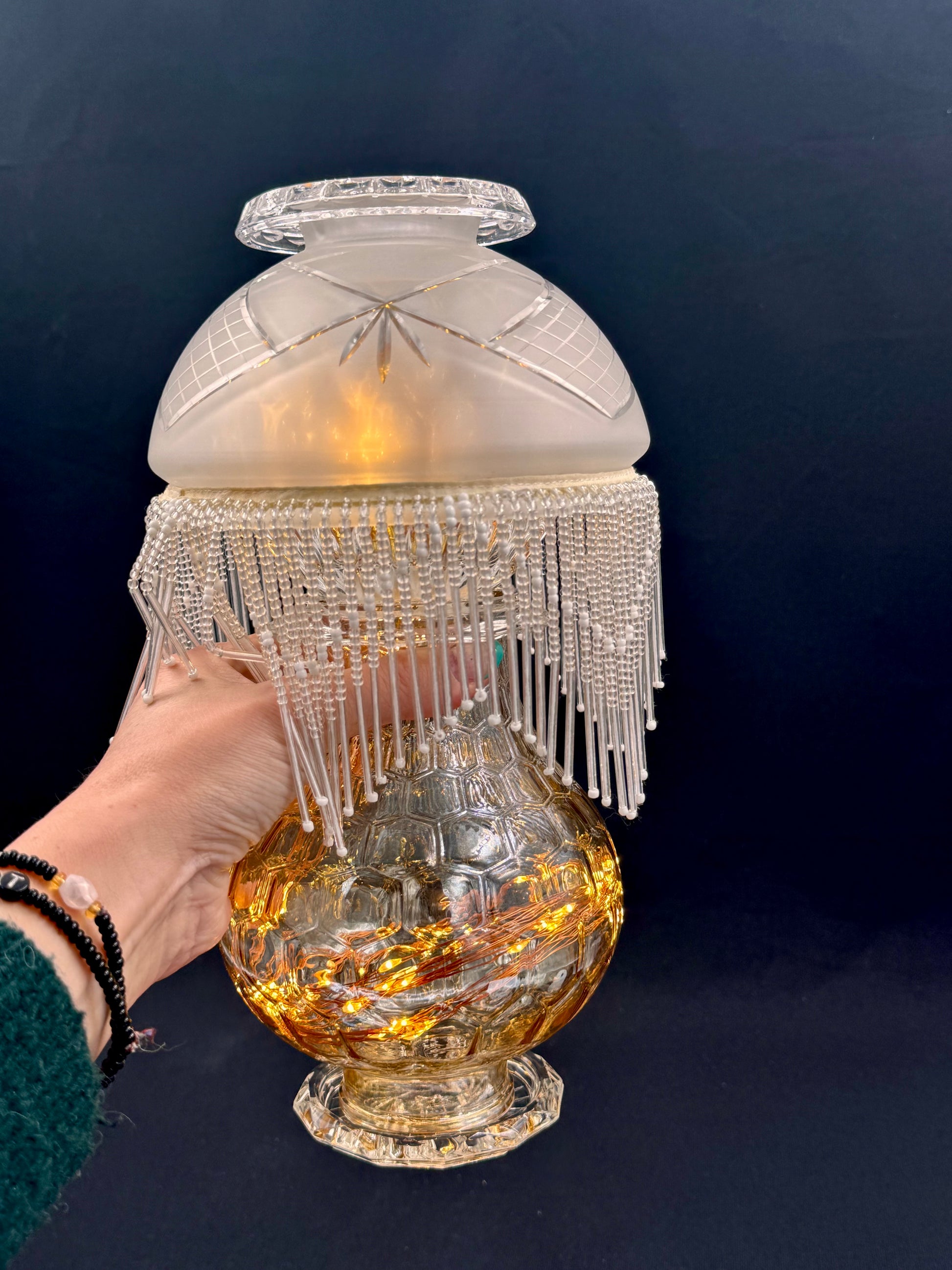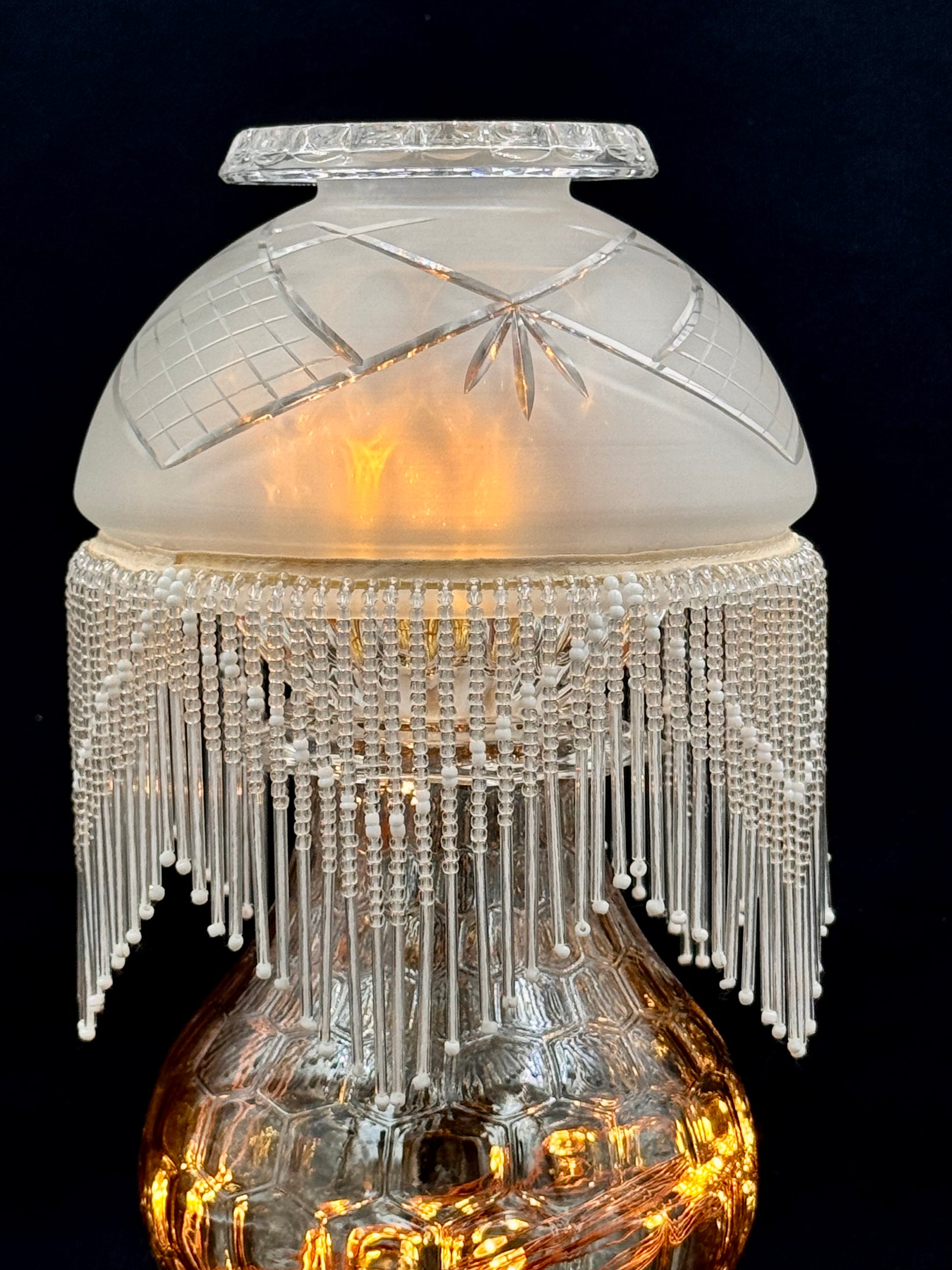 Vintage lyslenkelampe champagnefarget fot og hvit kuppel glassfrynser
