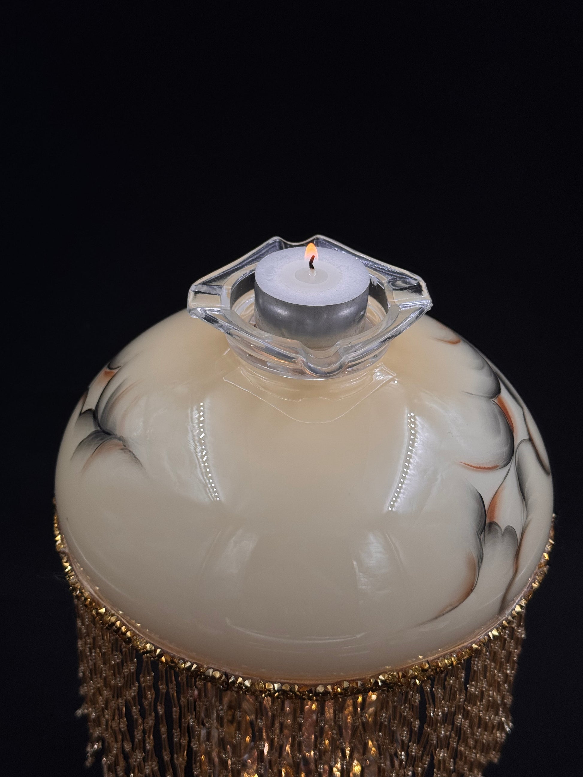 Vintage lyslenkelampe med champagnefot og kremfarget kuppel med frynser
