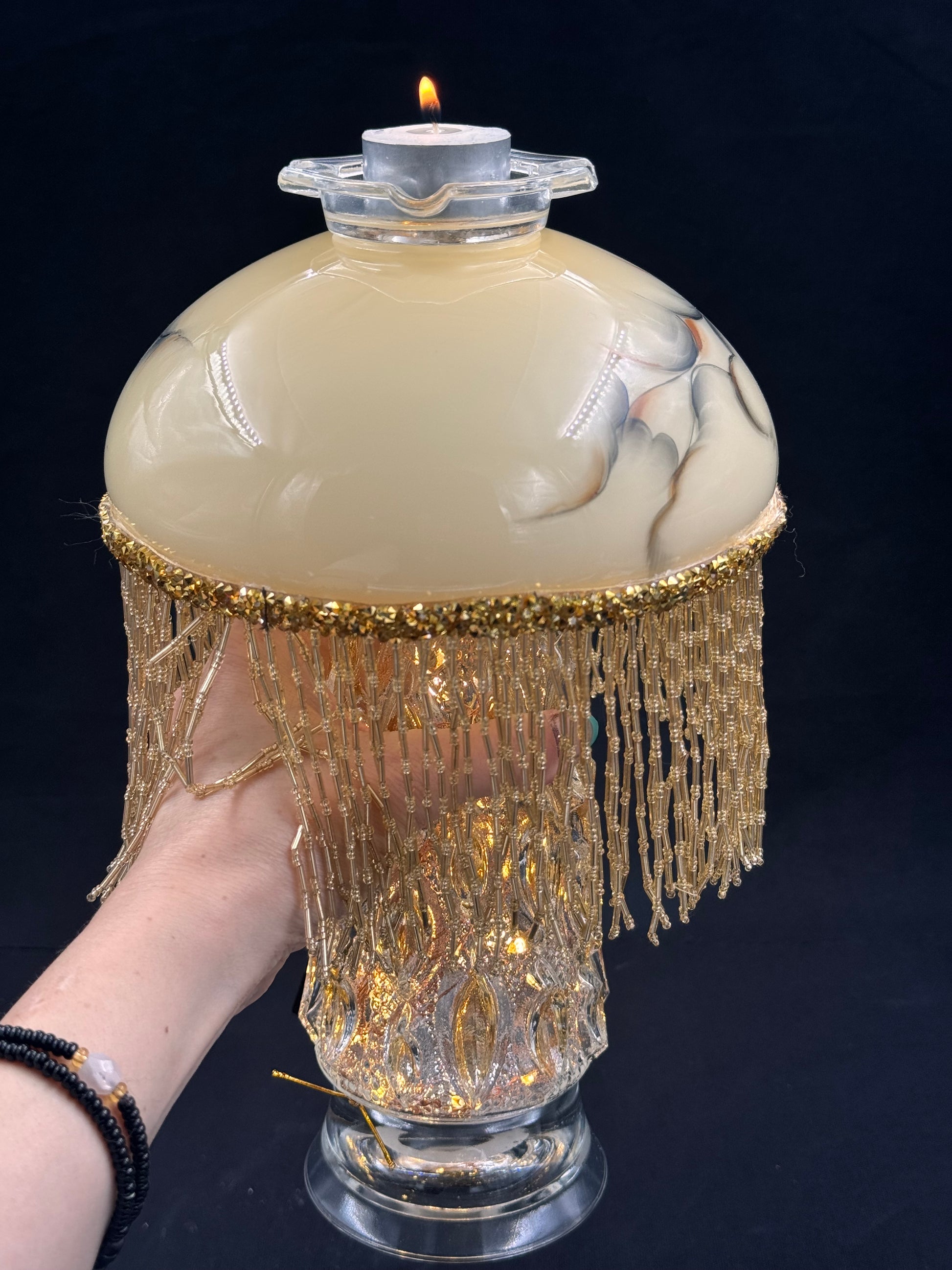 Denne fantastiske lampen har en fot fra en lampett og en vintage kuppel fra lysekrone. Vi elsker at foten gnistrer som en diamant i lyset. Fargepaletten er champagnetoner og klart glass. Kuppelen (som er fra mors gamle lysekrone) er kremfarget og vi har festet på lange perlefrynser.