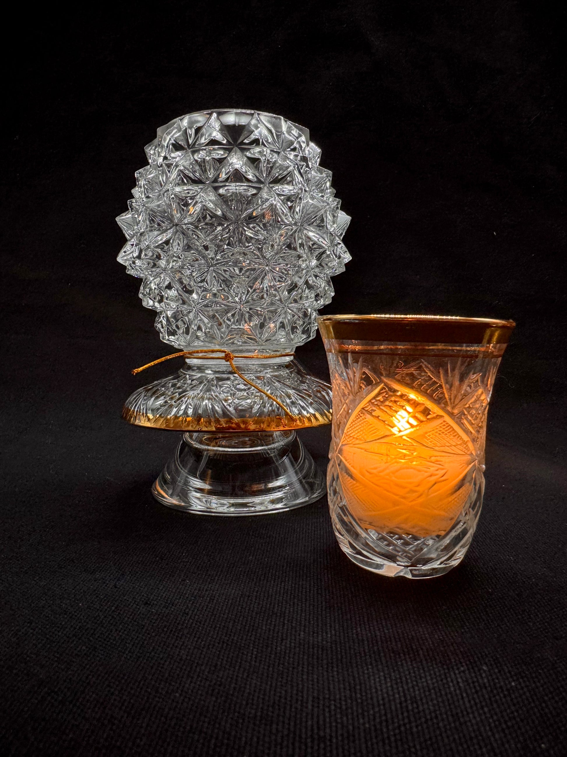 Vintage lyslykt i mønstret glass med gulldetaljer
