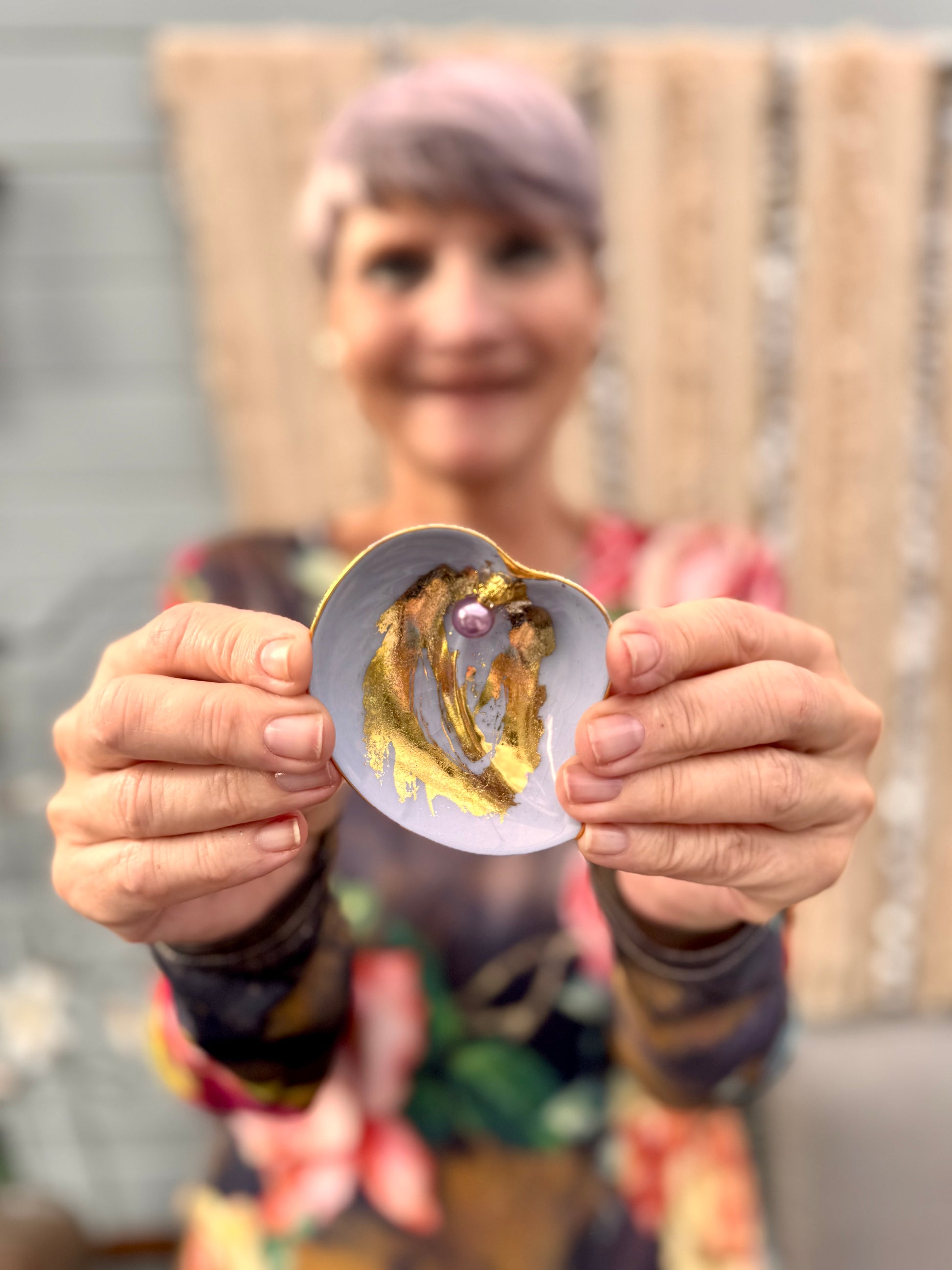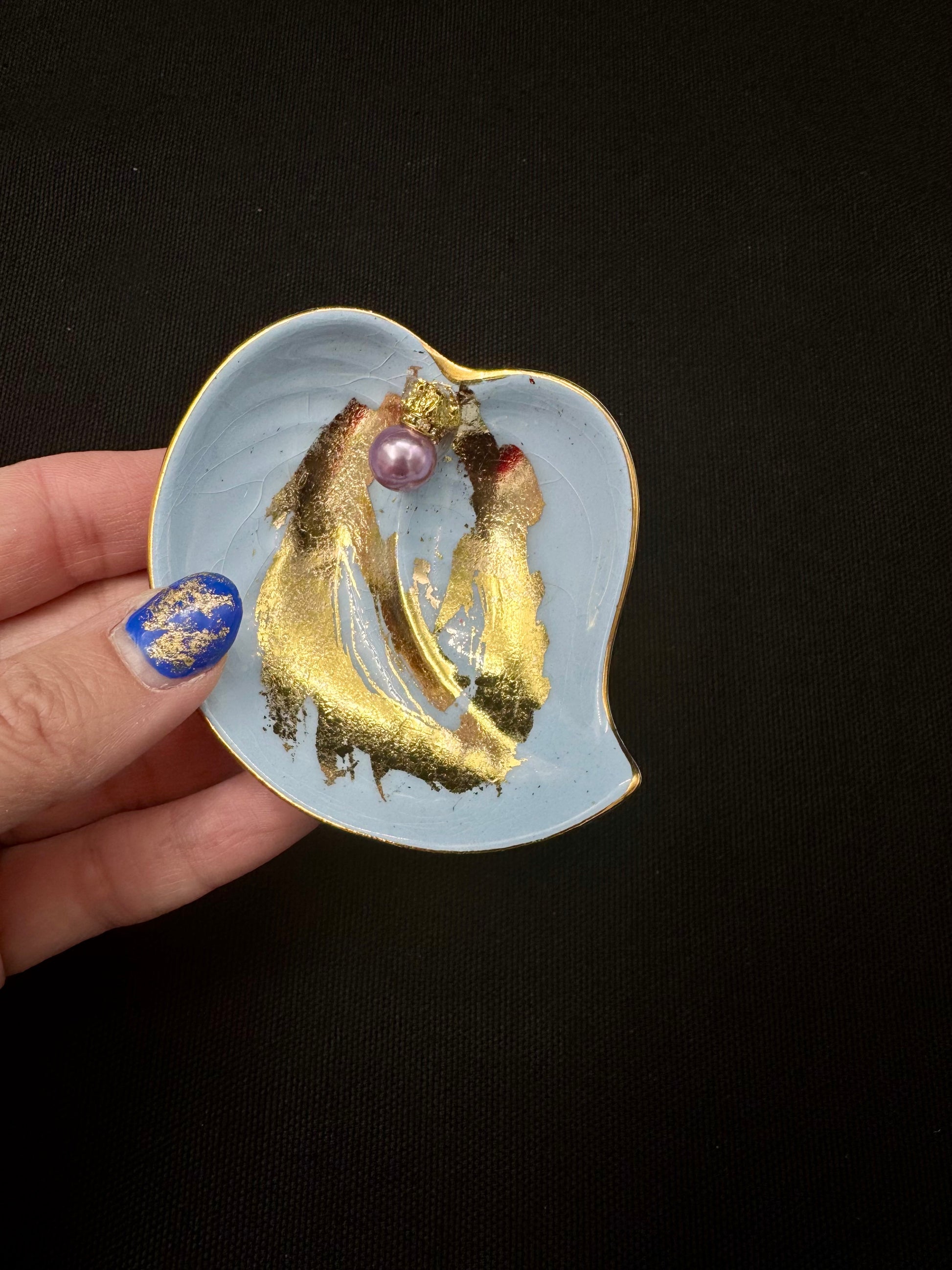 Vulvakunst er vintage fat som er pyntet med gull, perler og diamanter.