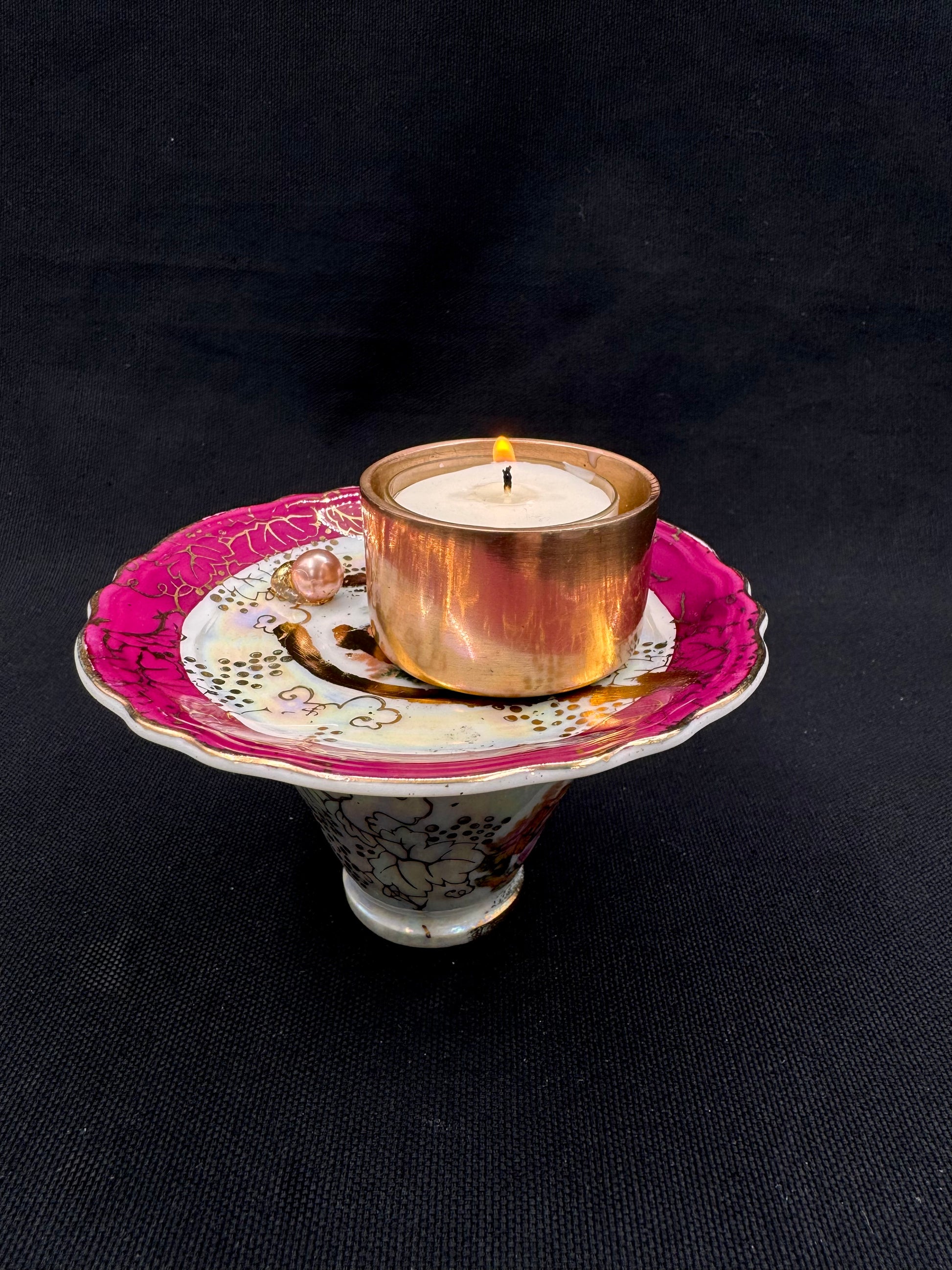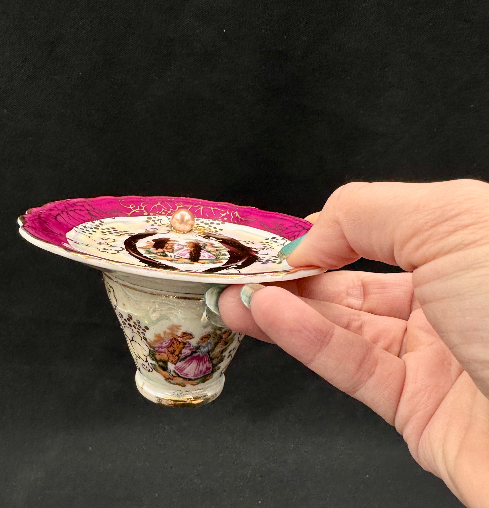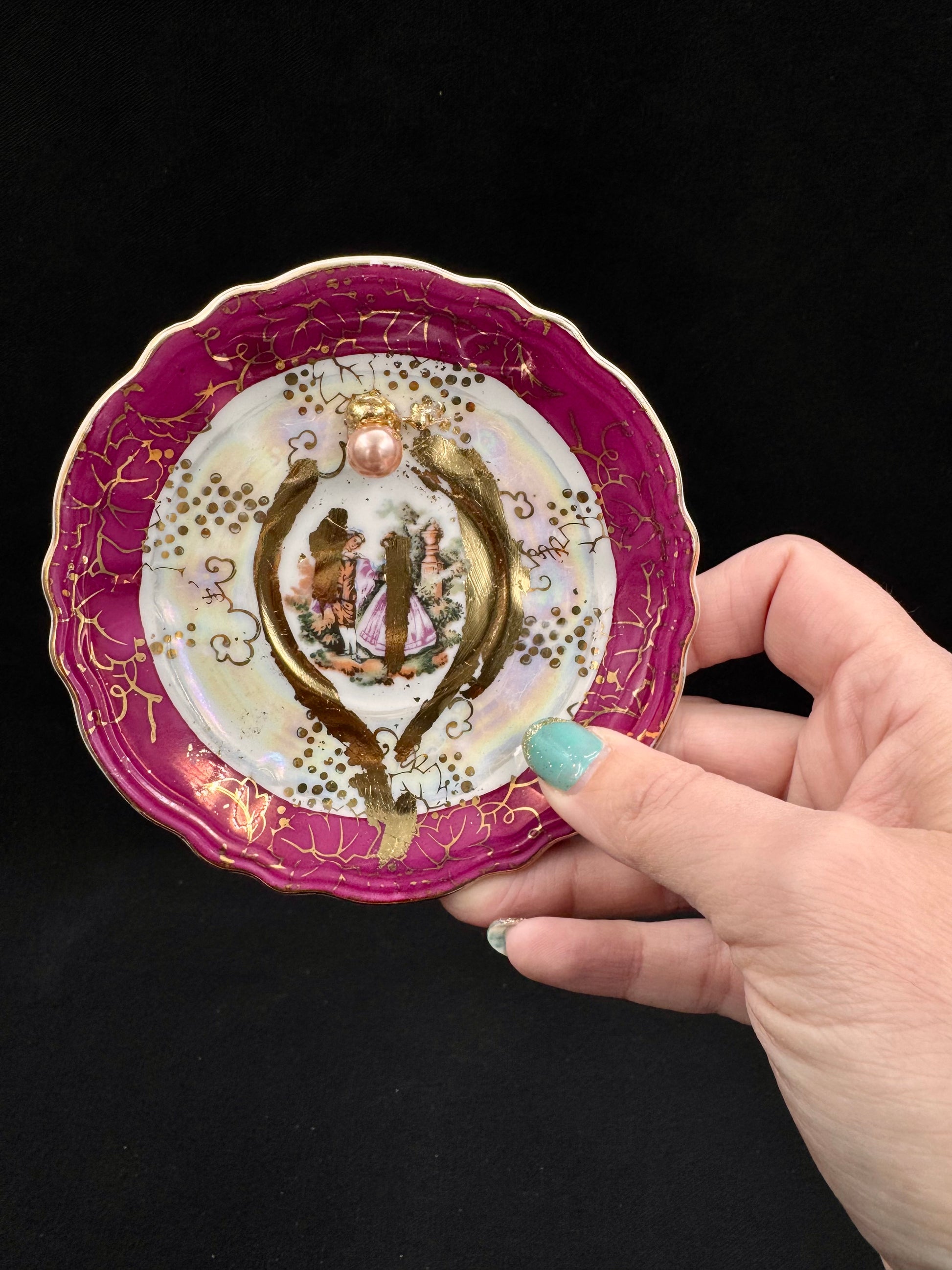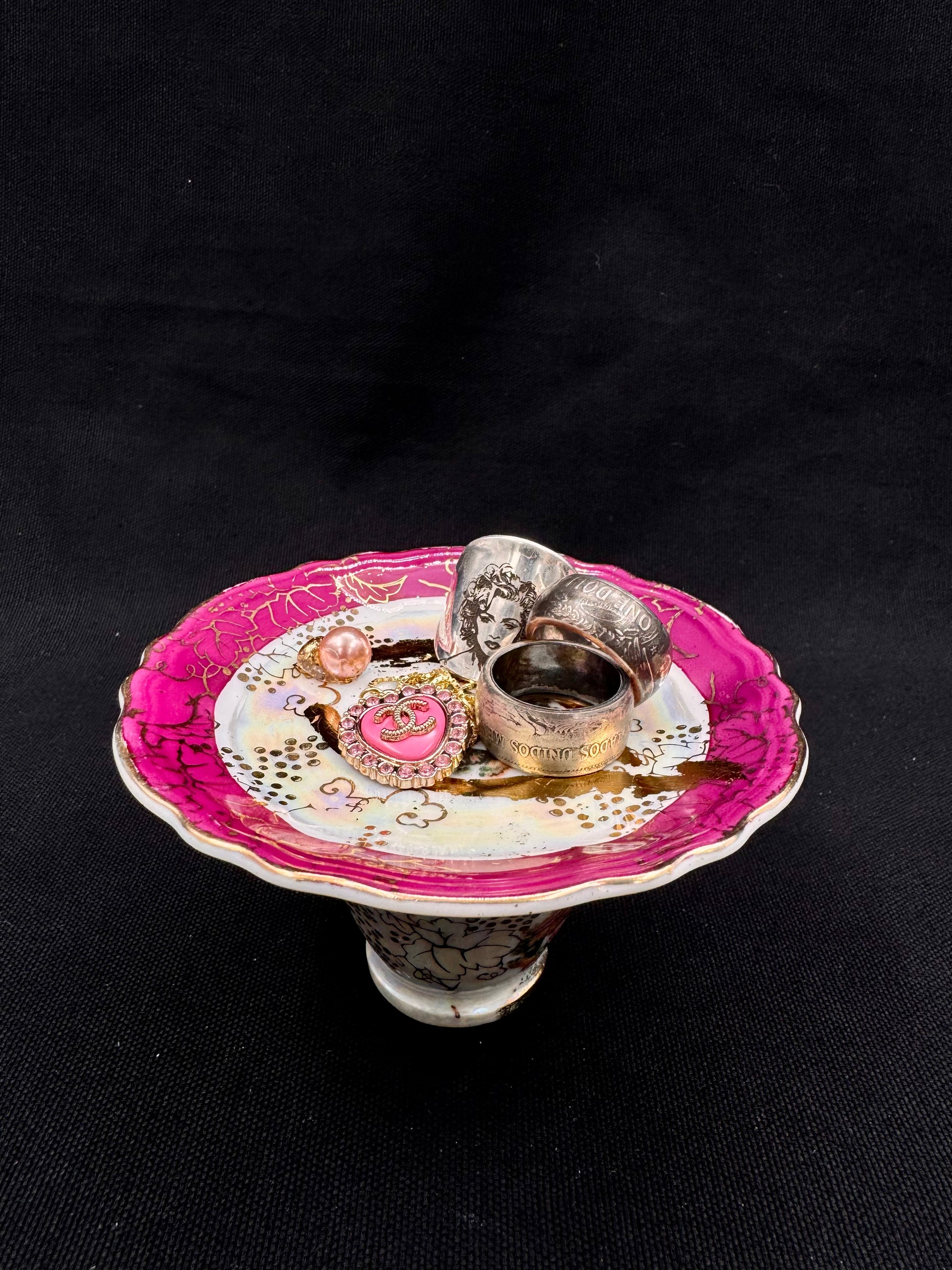 Farger: mørkerosa fat med bilde av prinsesser. Fatet er dekorert med chanpsgnefarget perle og gullvulva.