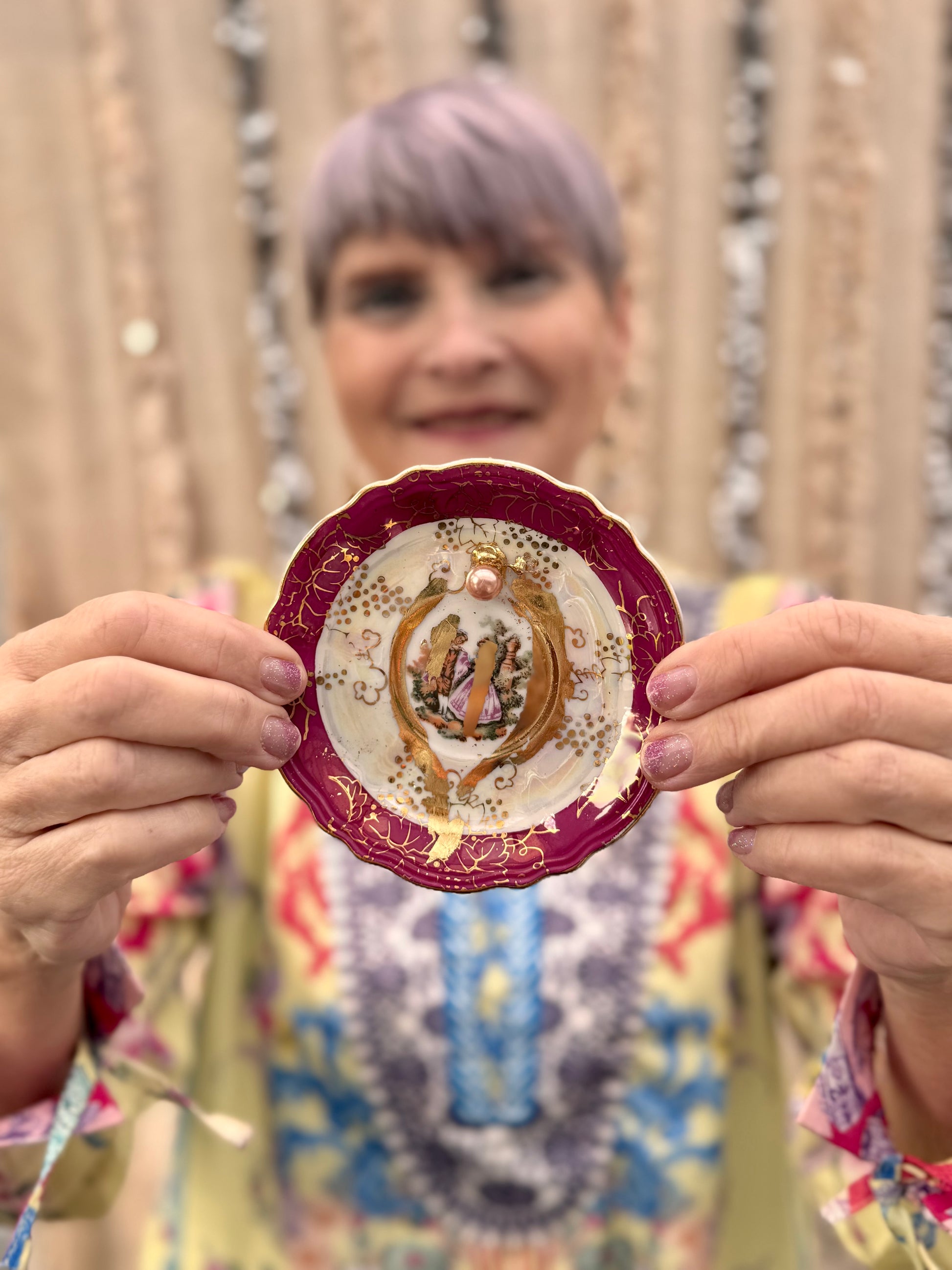 Vulvakunst er vintage fat som er pyntet med gull, perler og diamanter.