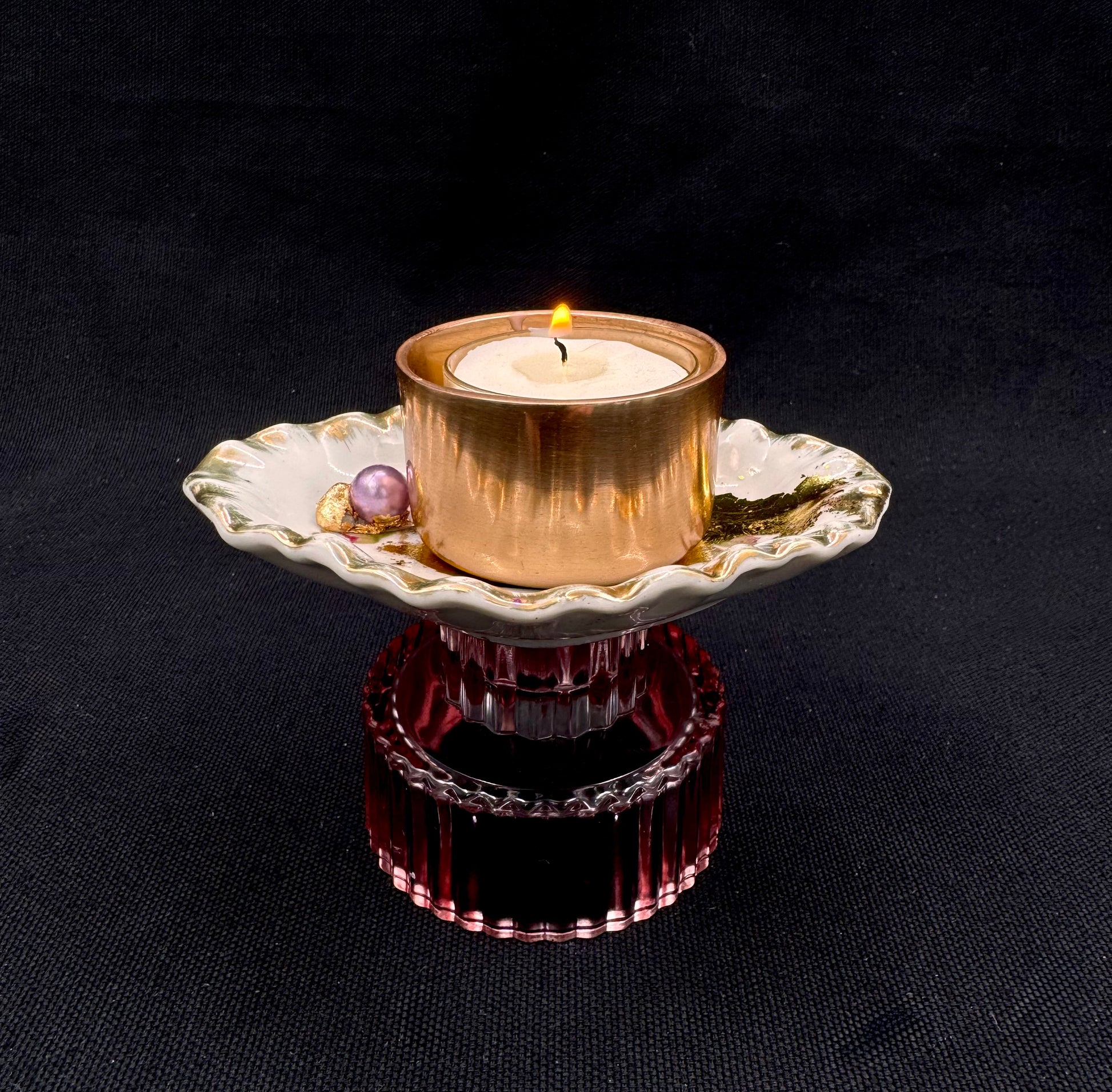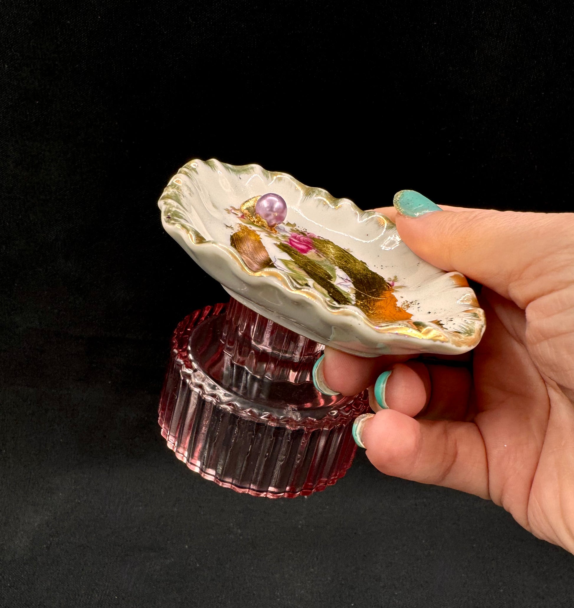 Farger: gammelt fat med lyslilla perle og gullvulva. Foten er rosa.