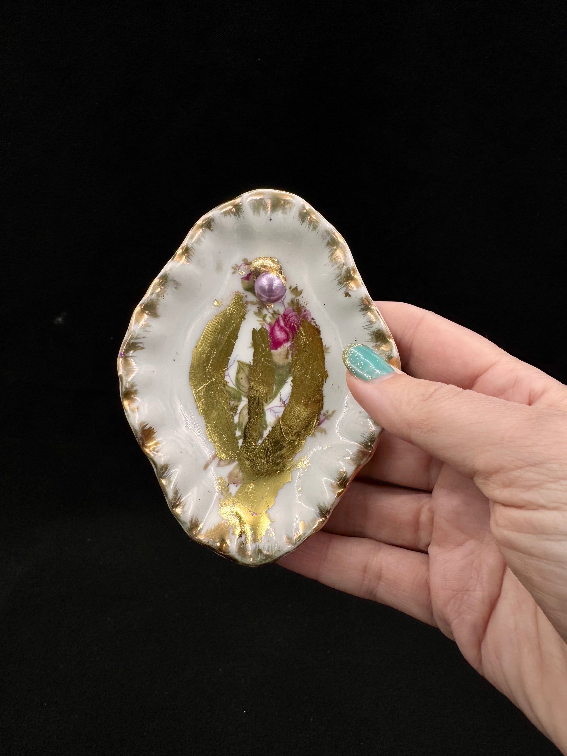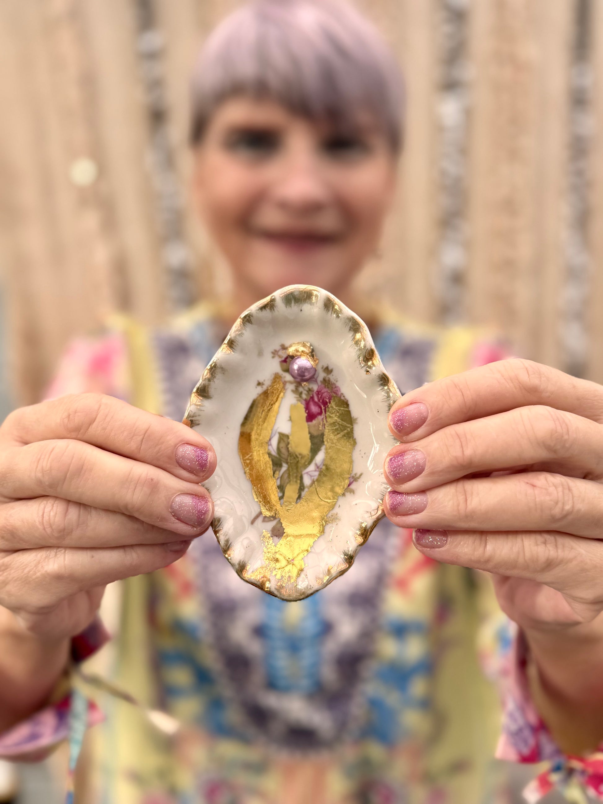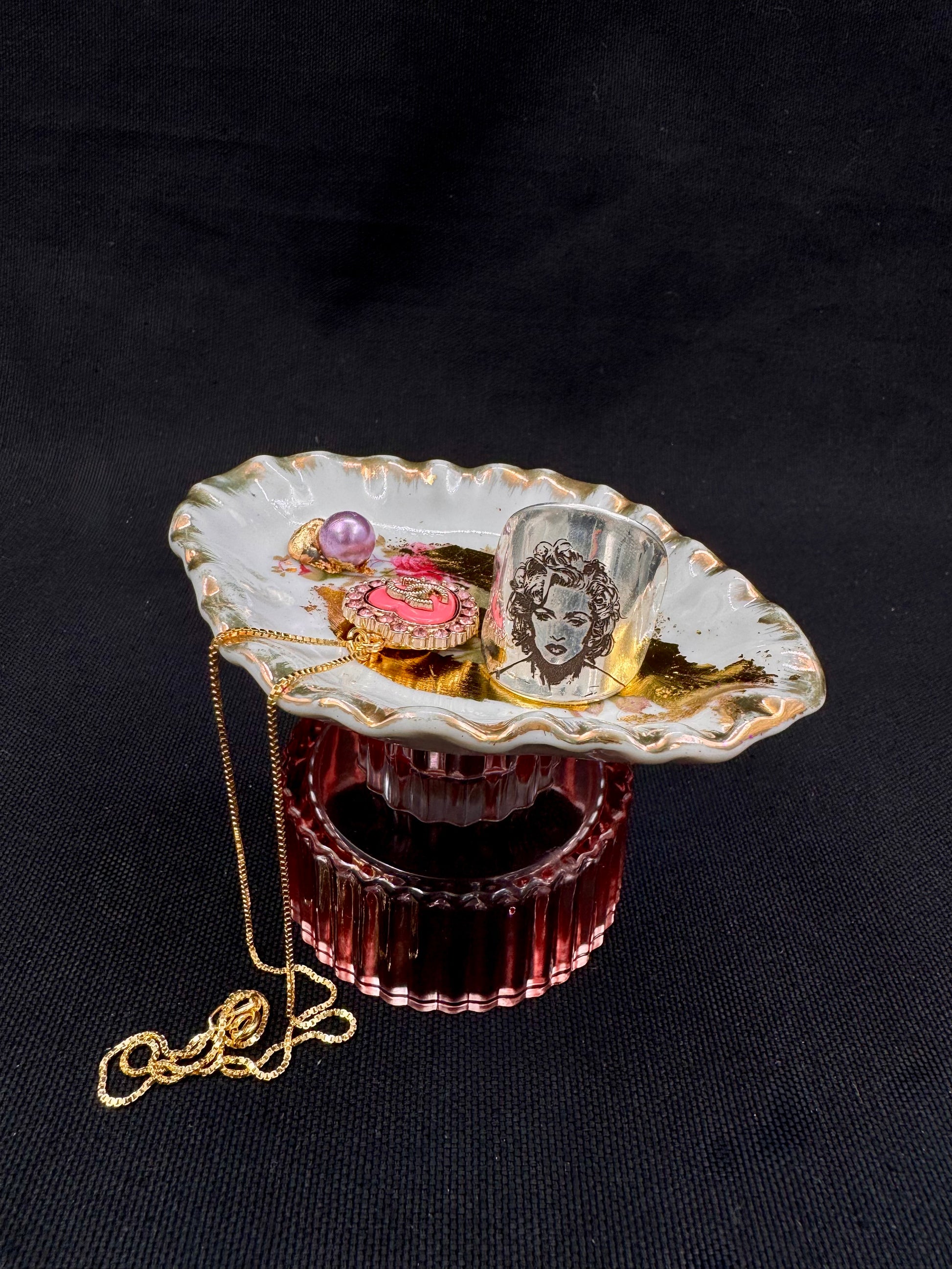 Vulvakunst er vintage fat som er pyntet med gull, perler og diamanter.